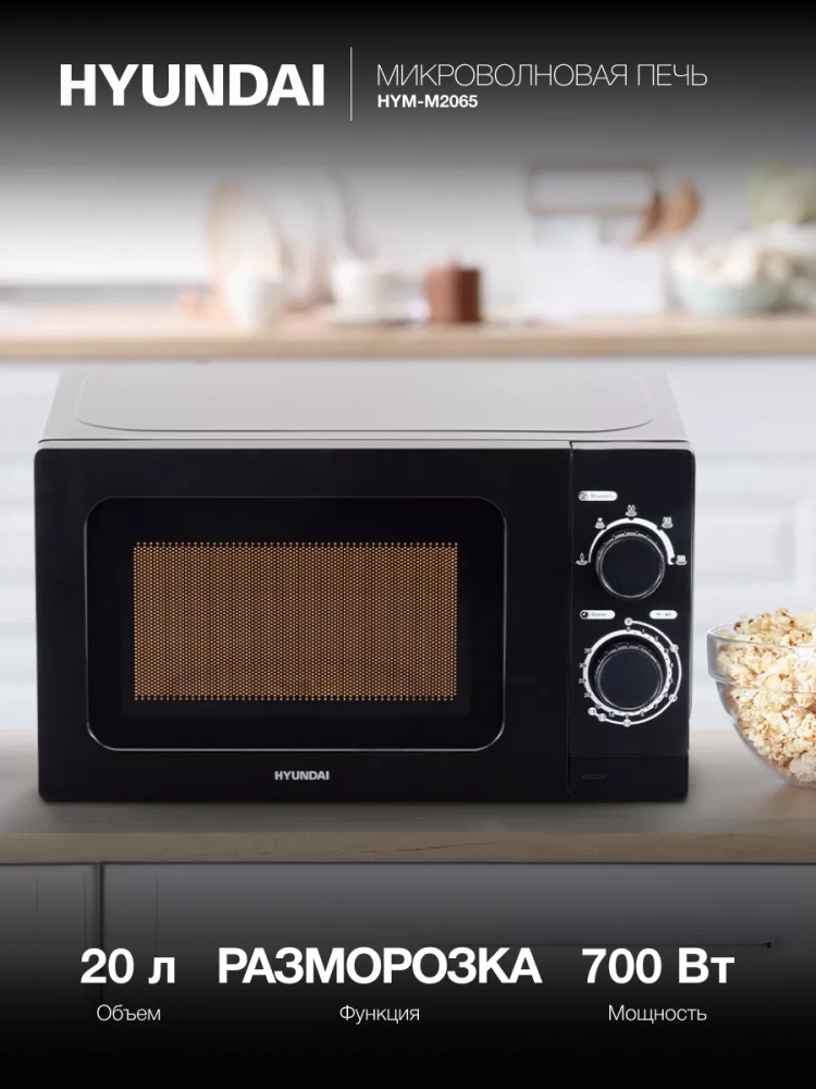 Микроволновая печь (СВЧ) Hyundai HYM-M2065 черный, мощность 700Вт, объем 20л, покрытие камеры эмаль легкой очистки, механическое управление.