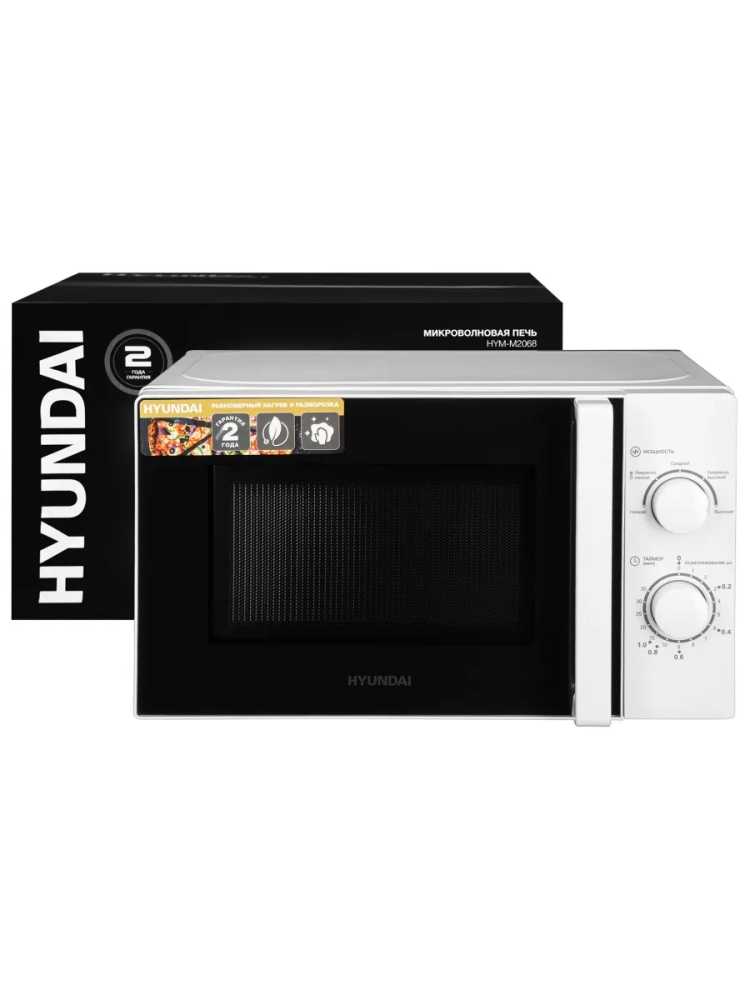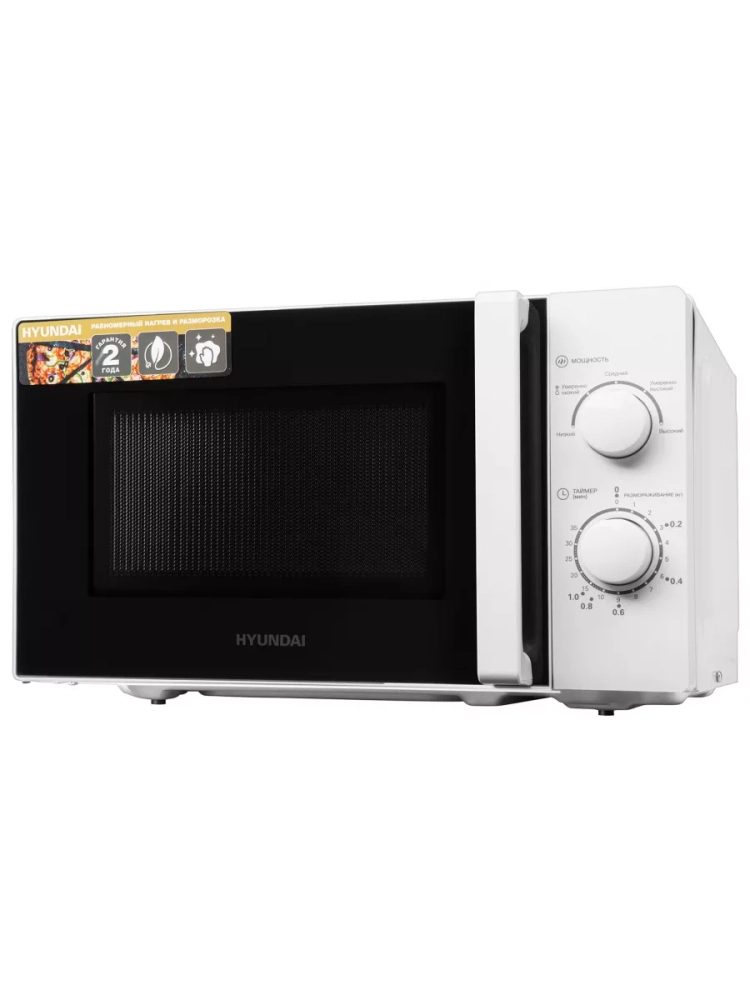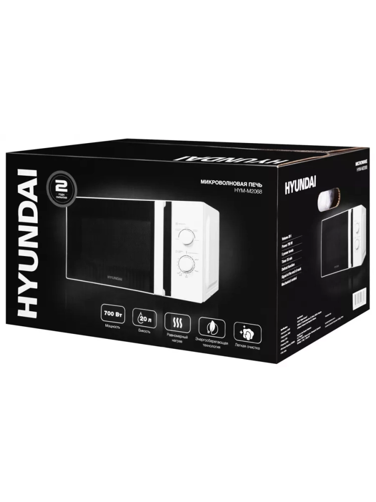 Для приготовления и разогрева блюд, разморозки продуктов может использоваться отдельно стоящая микроволновая печь Hyundai HYM-M2068 мощностью 700 Вт. Объем камеры равен 20 л, чего достаточно для небольшой семьи или офиса. Имеет механическое управление: переключатели мощности, времени и выполняемой операции расположены на передней панели. Внутренняя поверхность печи СВЧ имеет эмалированное термостойкое покрытие. Удалять с него остатки пищи несложно: для очистки достаточно использовать сухую или влажную салфетку. Дверца открывается с помощью ручки. Дисплей не предусмотрен. Вес упаковки составляет 11,2 кг.