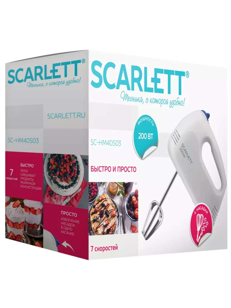 Миксер Scarlett SC-HM40S03 обладает множеством преимуществ: лаконичный дизайн, небольшой вес, эргономичная ручка. Благодаря 7 скоростям работы, переключать которые удобно прямо в процессе работы, легко довести любые ингредиенты до нужной консистенции. Специальные насадки-крюки замешают тесто для кексов, пирожков или пиццы. Венчики для взбивания справятся с приготовлением воздушного картофельного пюре, жидкого теста для блинов. Маленький мощный мини миксер для молочных коктейлей с венчиками