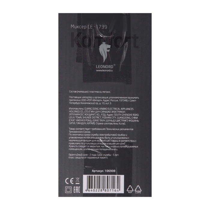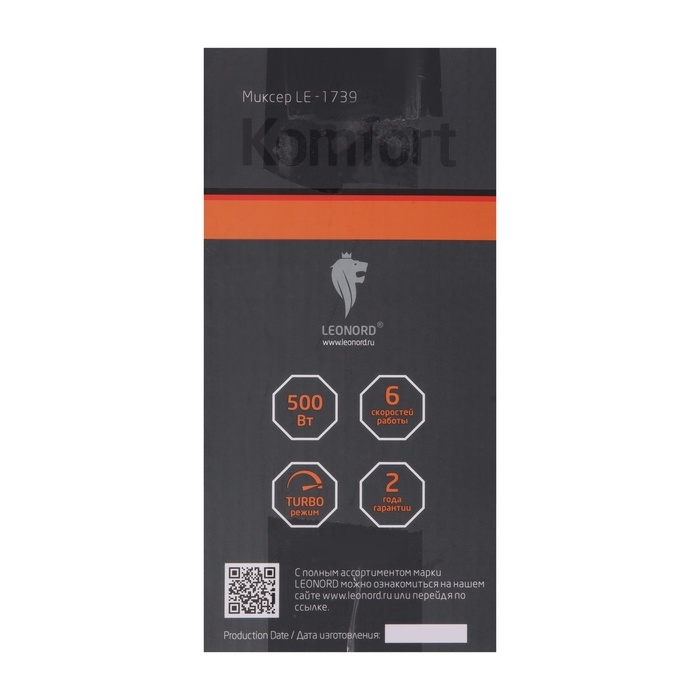 Миксер Leonord LE-1739, ручной, 500 Вт, 6 скоростей, режим "турбо", бежевый