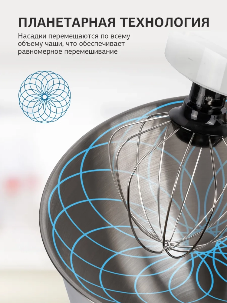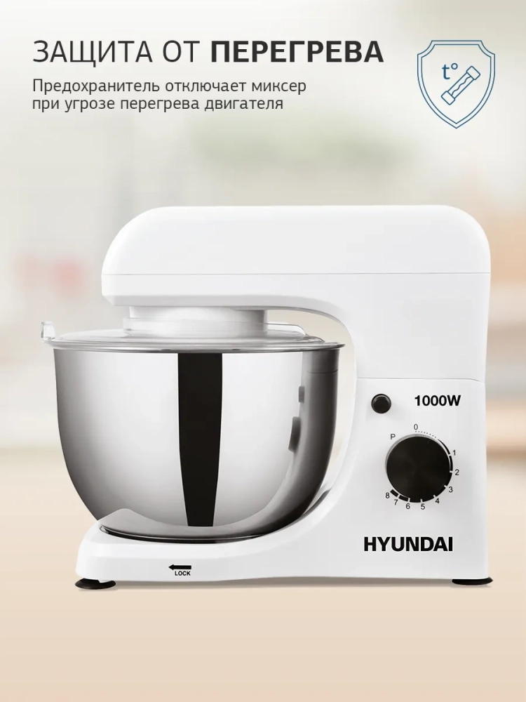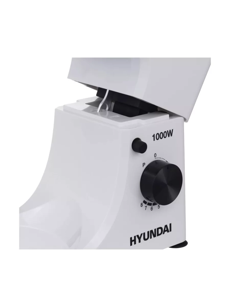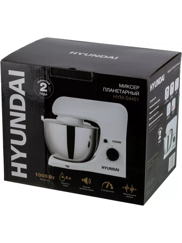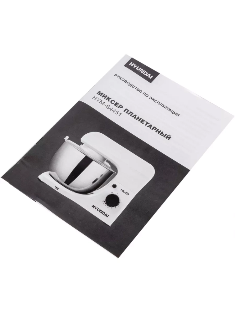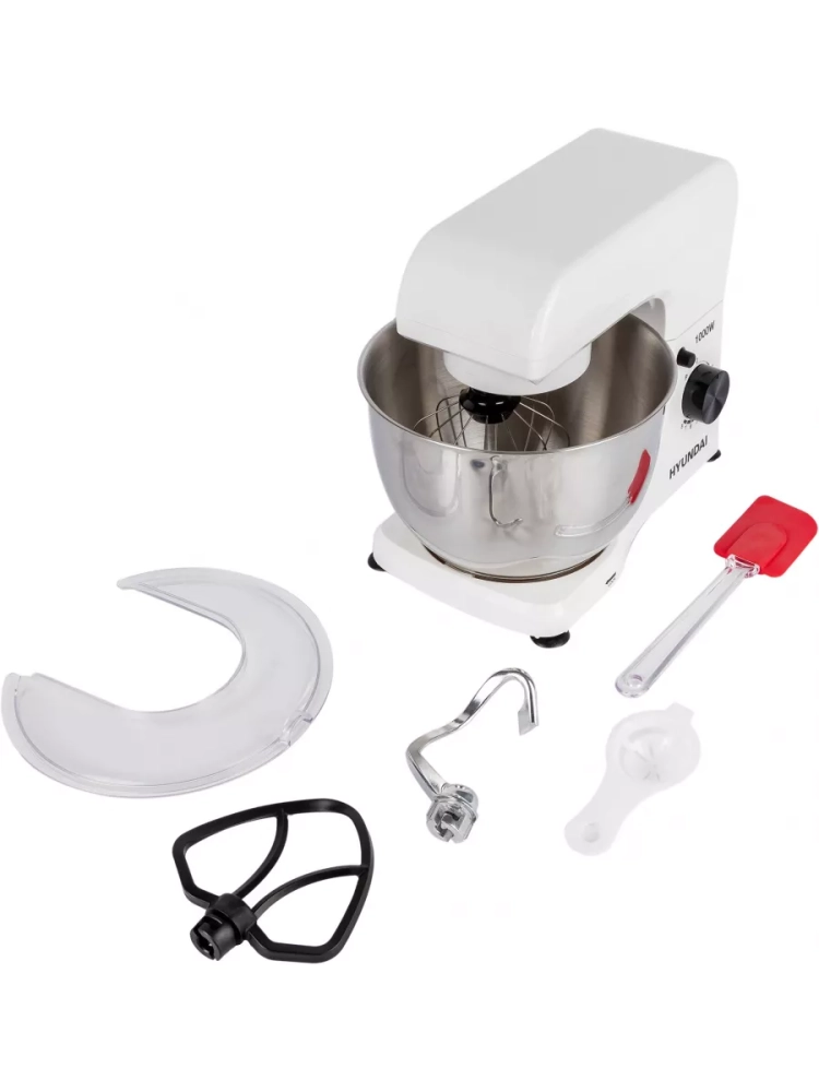 Миксер планетарный Hyundai HYM-S4451 белый/черный, мощность 1000Вт, количество скоростей 8, насадок 3. Комплектация: Планетарный миксер; чаша; защитная крышка; насадка-венчик; насадка-крюк; насадка-лопатка; кулинарная силиконовая лопатка; сепаратор для яиц; руководство пользователя с гаратийным талоном; книга рецептов.