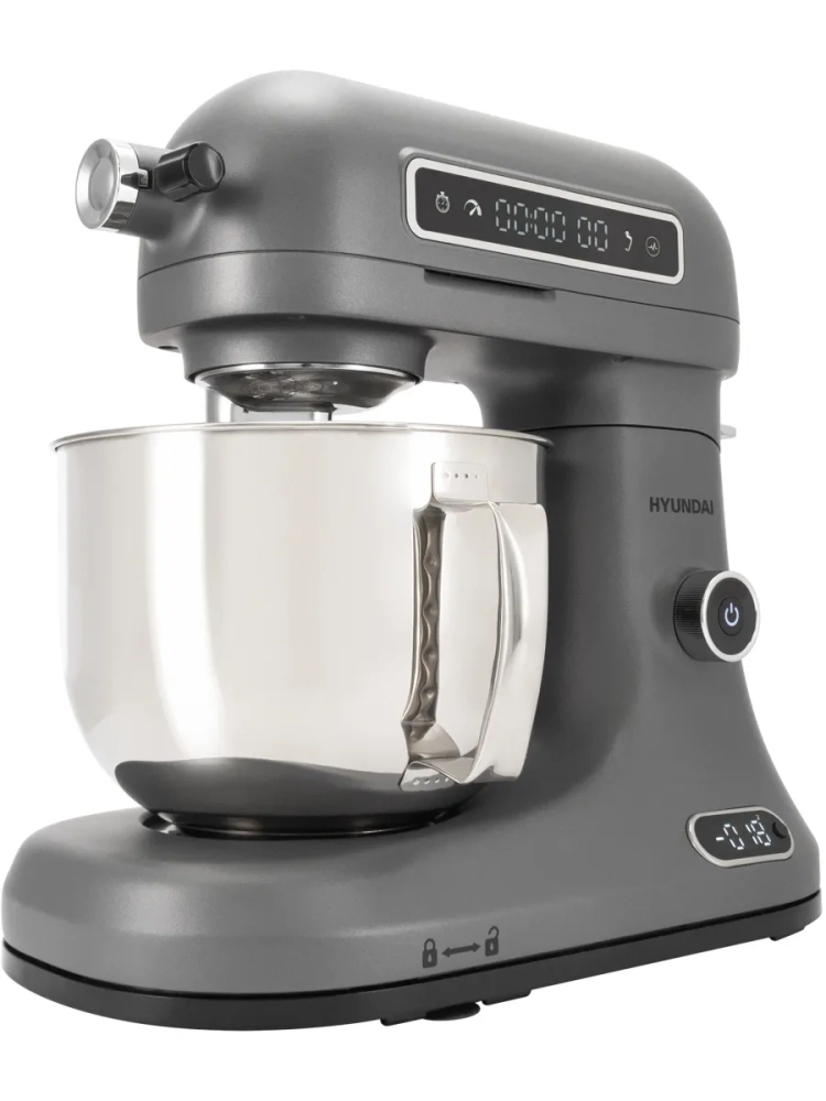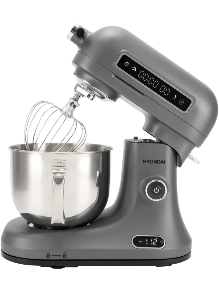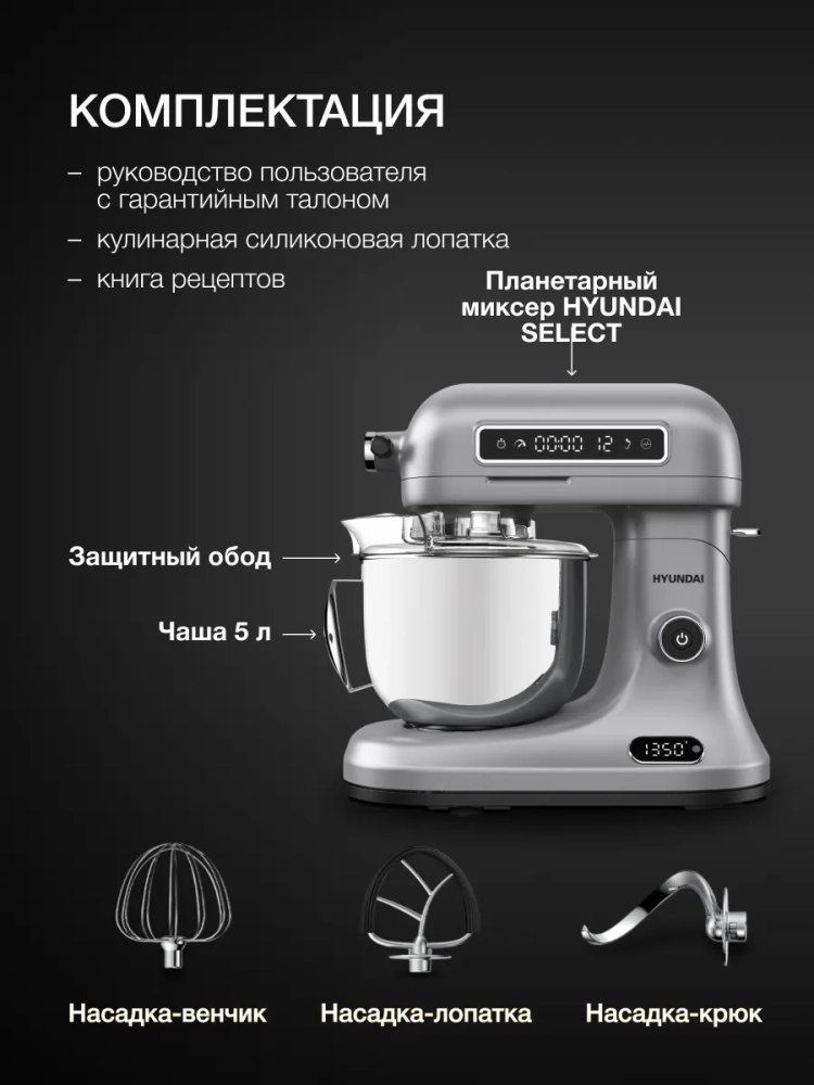 Миксер планетарный Hyundai HYM-S8551 серебристый, мощность 1600Вт, количество скоростей 12, насадок 3. В комплекте:Миксер; чаша; защитная крышка; насадка-венчик; насадка-лопатка с гибким ребром; насадка-крюк; кулинарная силиконовая лопатка; книга рецептов; инструкция с гарантийным талоном