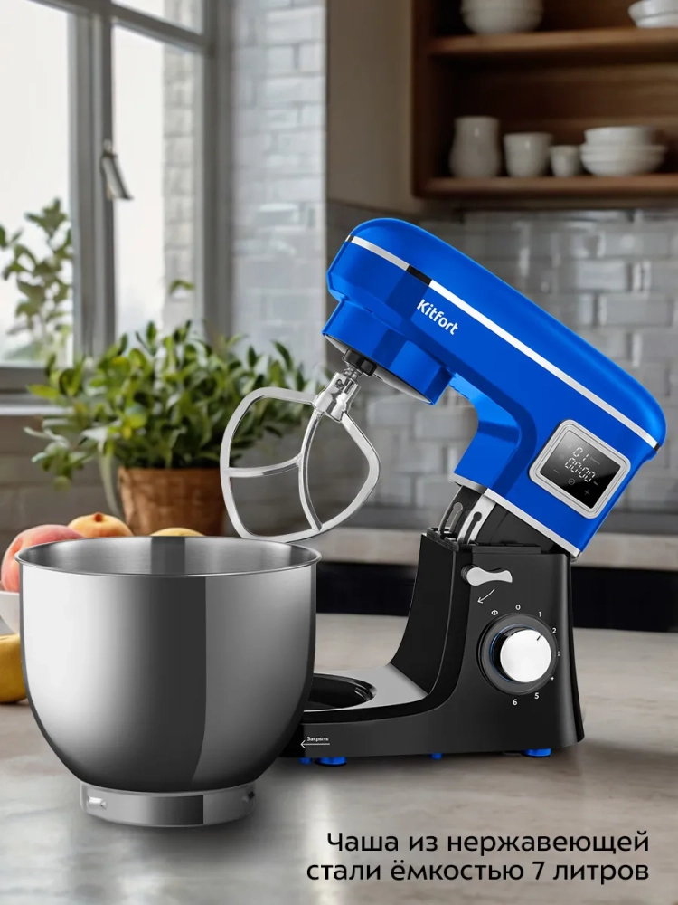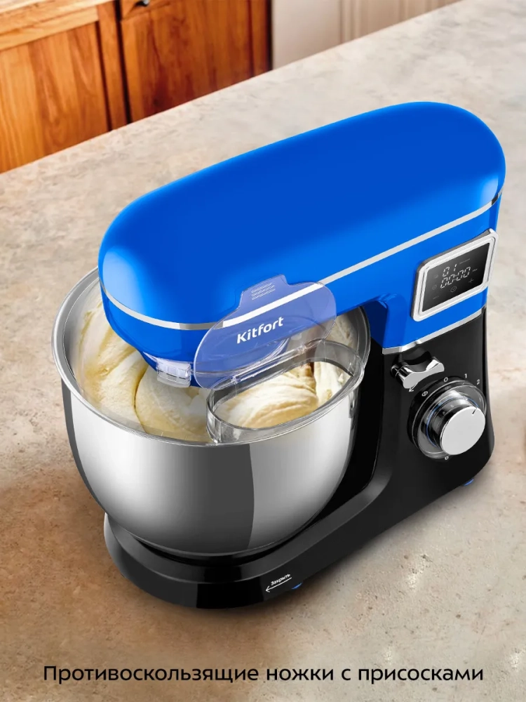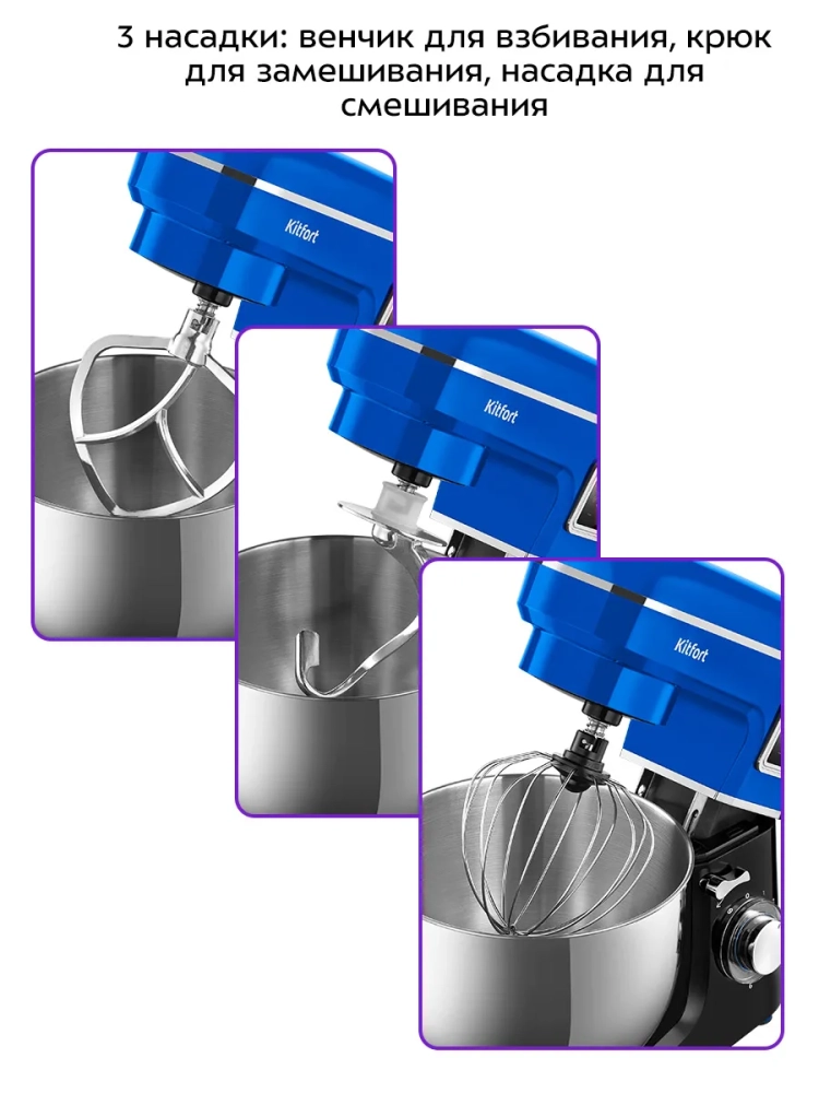 Планетарный миксер Kitfort КТ-3466 поможет вам смешать ингредиенты, взбить яичный белок или сливки, приготовить картофельное пюре, соус, крем, мусс, замесить жидкое тесто для блинов и крутое — для пельменей и пирогов. В комплекте есть три насадки.