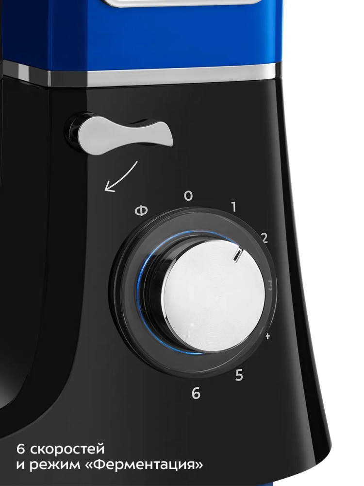 При включении миксера скорость вращения регулируется, чтобы предотвратить разбрызгивание ингредиентов. У прибора 6 скоростей и режим «Ферментация». В режиме «Ферментация» чаша будет подогреваться до 45 °С. Время работы режима регулируется таймером. Этот режим позволяет провести расстойку теста прямо в чаше.