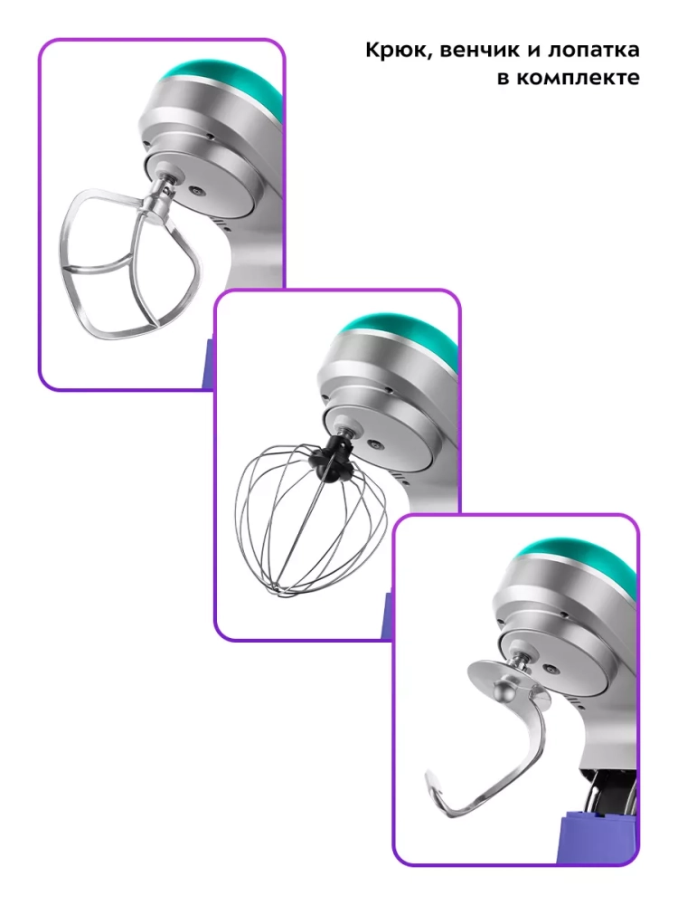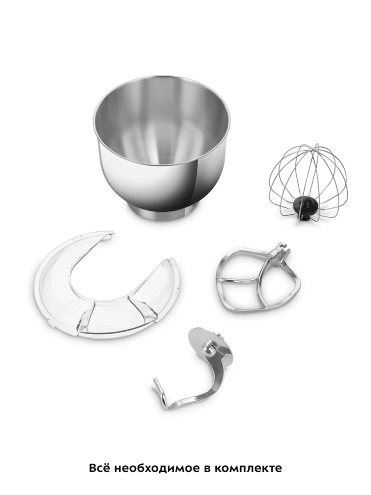 В комплекте есть три насадки. Венчик служит для взбивания яичных белков, сливок, замешивания жидкого теста. Насадка для смешивания используется для негустых ингредиентов, приготовления картофельного пюре, томатной пасты, кондитерских смесей или теста для тортов. Крюк для замешивания подойдет для замешивания густого теста.
