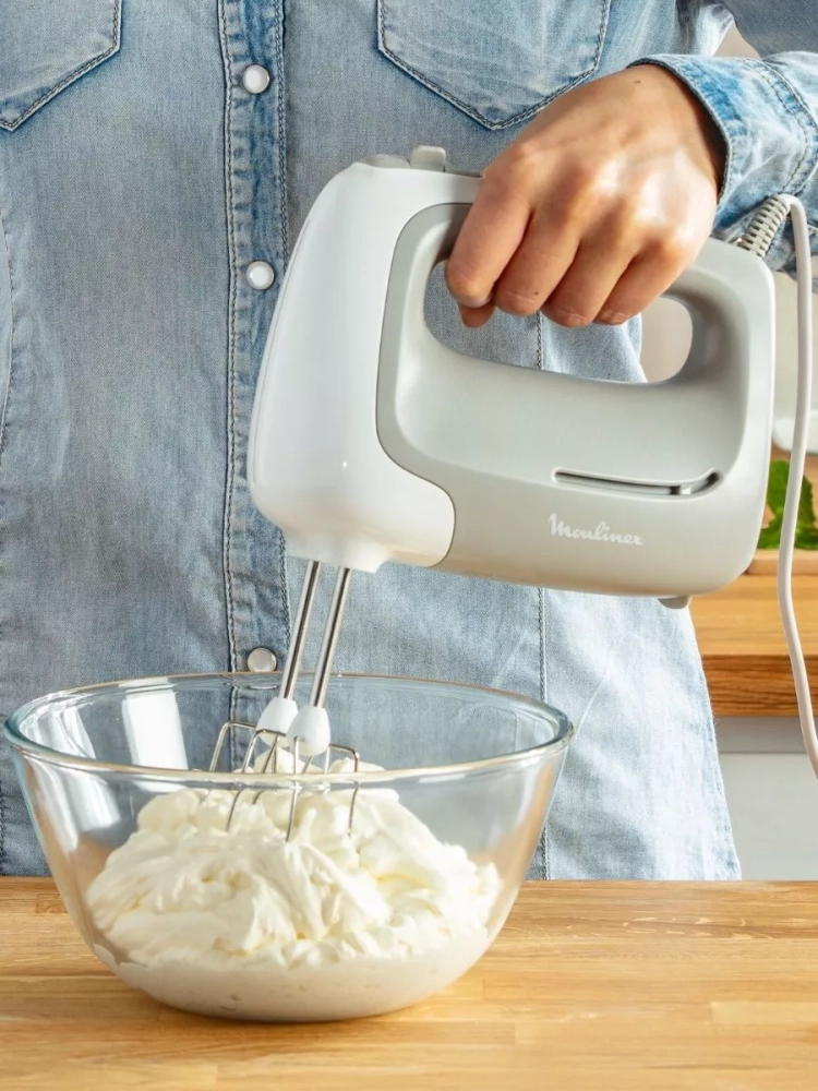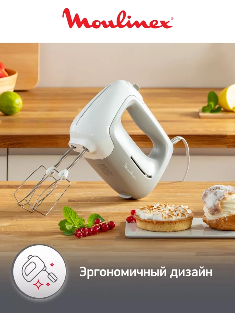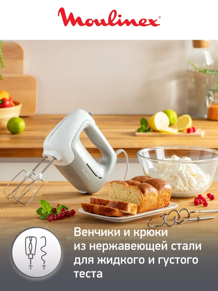 Благодаря комплекту металлических венчиков электрический миксер обеспечивает идеальное качество взбивания, позволяя легко приготовить жидкое тесто, смеси для кексов, взбить белки от яиц и сливки. Кроме того, в наборе есть крюки из нержавеющей стали, с помощью которых можно замешивать тесто для пиццы или хлеба. Благодаря продуманному комфортному дизайну миксер Мулинекс удобно использовать каждый день. Устойчивое основание прибора позволяет ставить его вертикально на стол, сохраняя рабочую поверхность чистой. К тому же все съемные детали вы с легкостью сможете мыть в посудомоечной машине.