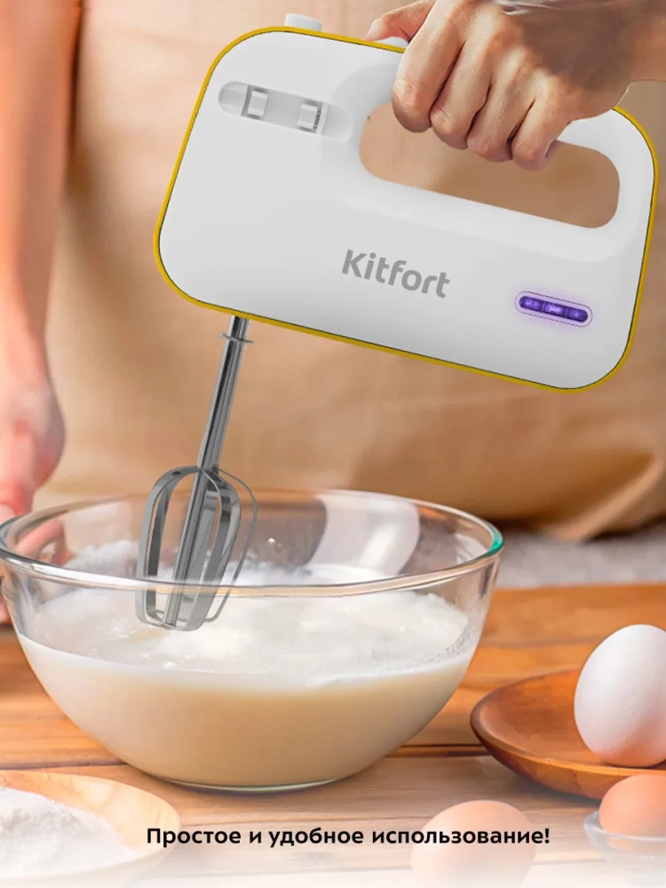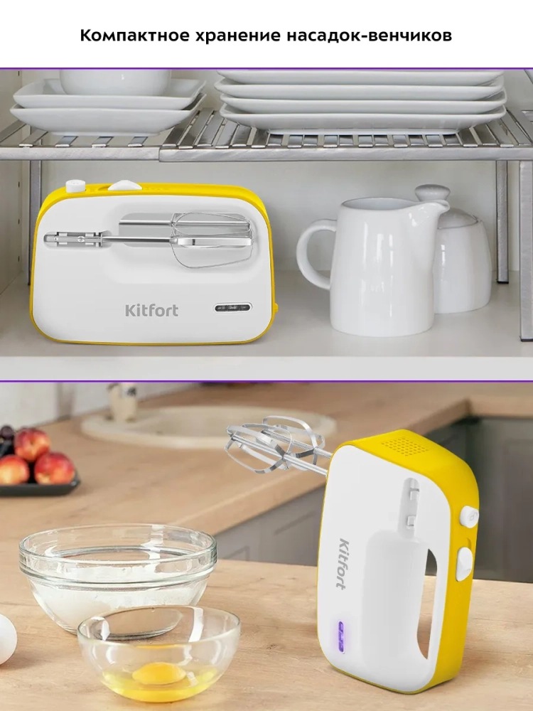 Прибор оснащен одним комплектом насадок: венчиками для взбивания ингредиентов и замеса жидкого теста для блинов, вафель или бисквитов. Насадки легко снимаются с моторного блока, поэтому уход за устройством не составит труда. Для удобства у миксера есть специальная кнопка для снятия насадок. Также на корпусе есть держатели насадок для компактного и удобного хранения устройства.