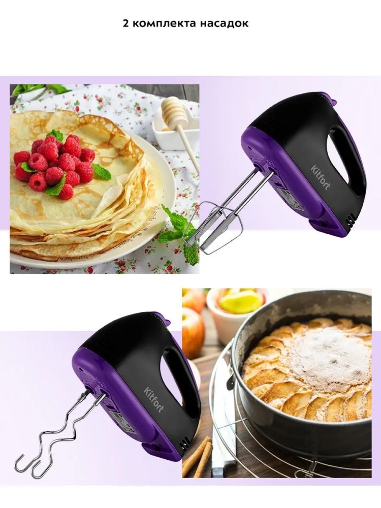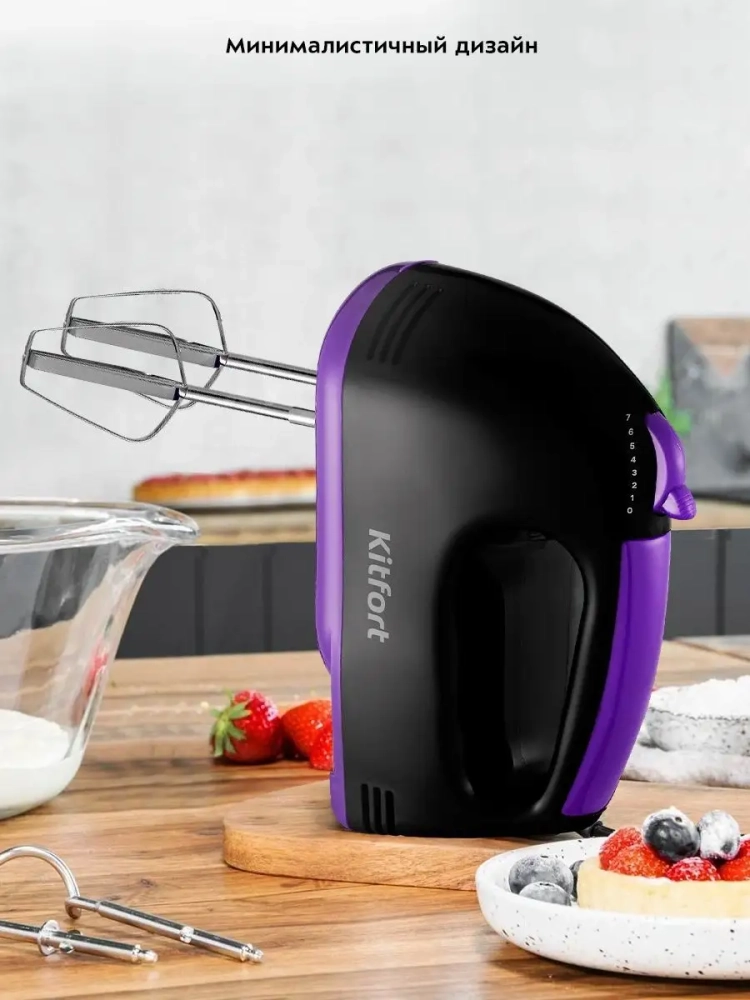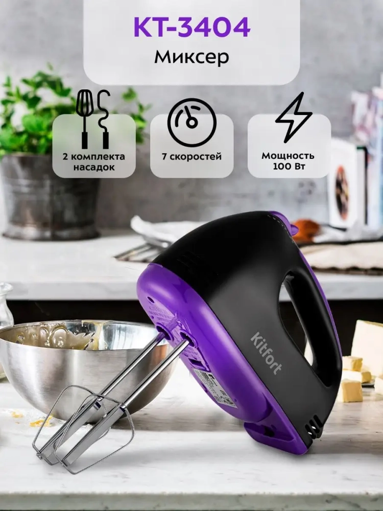 Китфорт КТ-3404 — ручной миксер, который поможет вам смешать ингредиенты, взбить яичный белок или сливки, приготовить соус, крем, мусс, замесить тесто для выпечки.