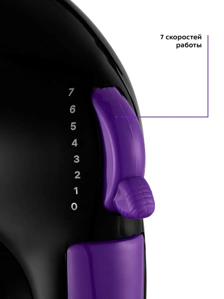 Миксер оснащен 7 скоростями работы, благодаря чему вы сможете выбрать подходящую скорость для взбивания или смешивания ингредиентов. Регулятор скорости расположен на ручке миксера, поэтому переключить скорость во время работы будет легко и удобно. Регулятор скорости также является кнопкой извлечения насадок.