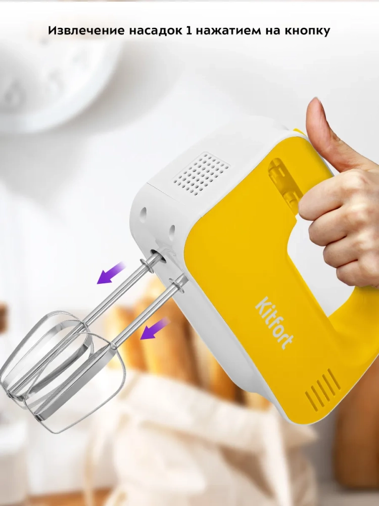Прибор оснащен одним комплектом насадок: венчиками для взбивания ингредиентов и замеса жидкого теста для блинов, вафель или бисквитов. Насадки легко снимаются с моторного блока, поэтому уход за устройством не составит труда. Для удобства у миксера есть специальная кнопка для снятия насадок. Также на корпусе есть держатели насадок для компактного и удобного хранения устройства.