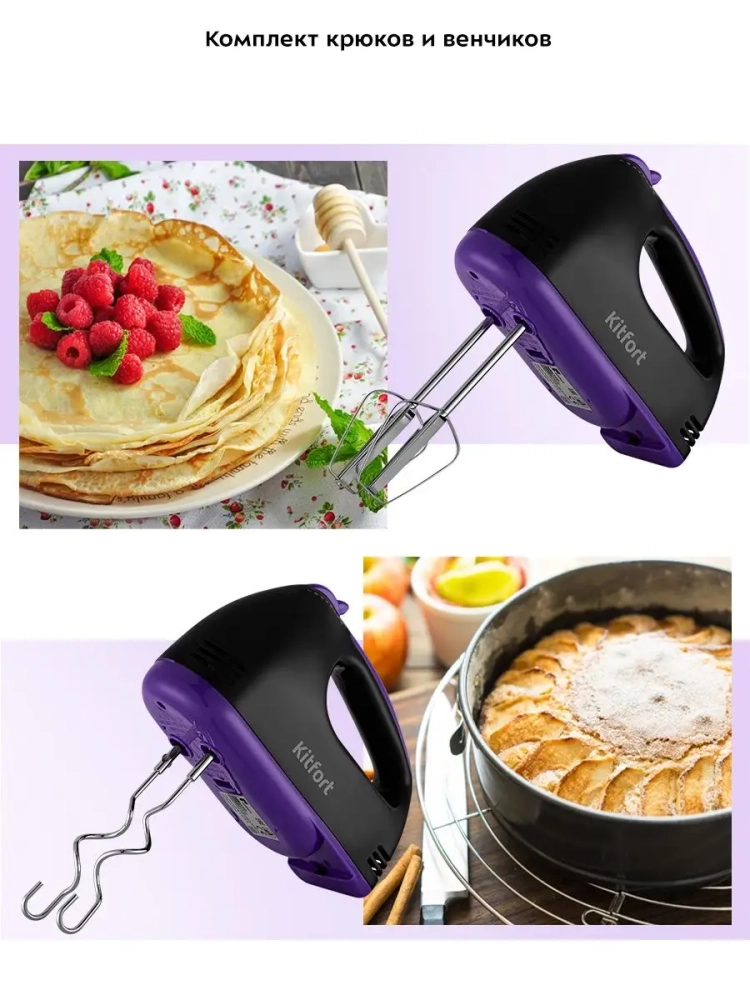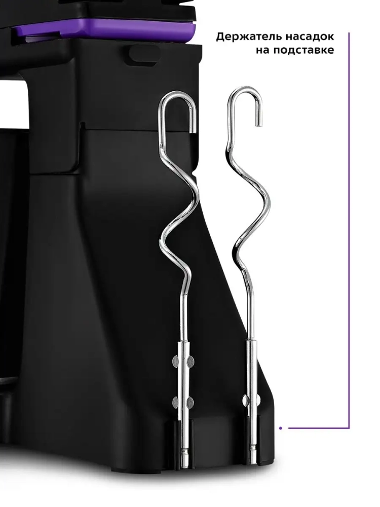 Прибор оснащен двумя комплектами насадок: венчики подходят для взбивания ингредиентов и замеса жидкого теста для блинов, вафель или бисквитов, а крюки — для замеса более густого теста, например песочного или дрожжевого. Насадки легко снимаются с моторного блока, поэтому уход за устройством не составит труда.