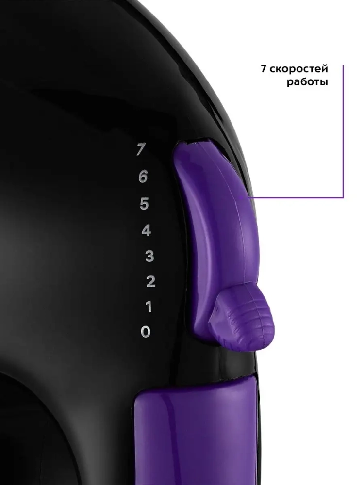 Миксер оснащен 7 скоростями работы, благодаря чему вы сможете выбрать подходящую скорость для взбивания или смешивания ингредиентов. Регулятор скорости расположен на ручке миксера, поэтому переключить скорость во время работы будет легко и удобно.
