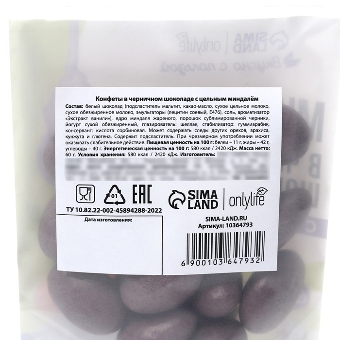 Состав: белый шоколад (подсластитель мальгит, какао-масло, сухое цельное молоко, сухое обезжиреное молоко, эмульгаторы (лецитин соевый, Е476), соль, ароматизатор "Экстракт ванили"), ядро миндаля жареного, порошок сублимированной черники, йогурт сухой обезжиренный, глазирователь: шеллак, стабилизатор: гуммиарабик: консервант: кислота сорбиновая.