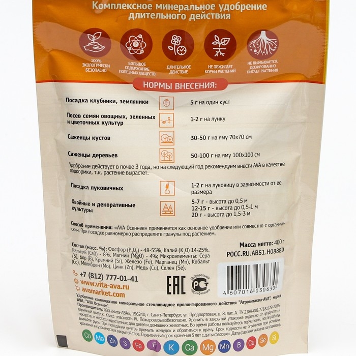 Способ применения: «AVA осеннее» применяется как основное удобрение или совместно с органическими. При посадке равномерно распределите гранулы под растением.