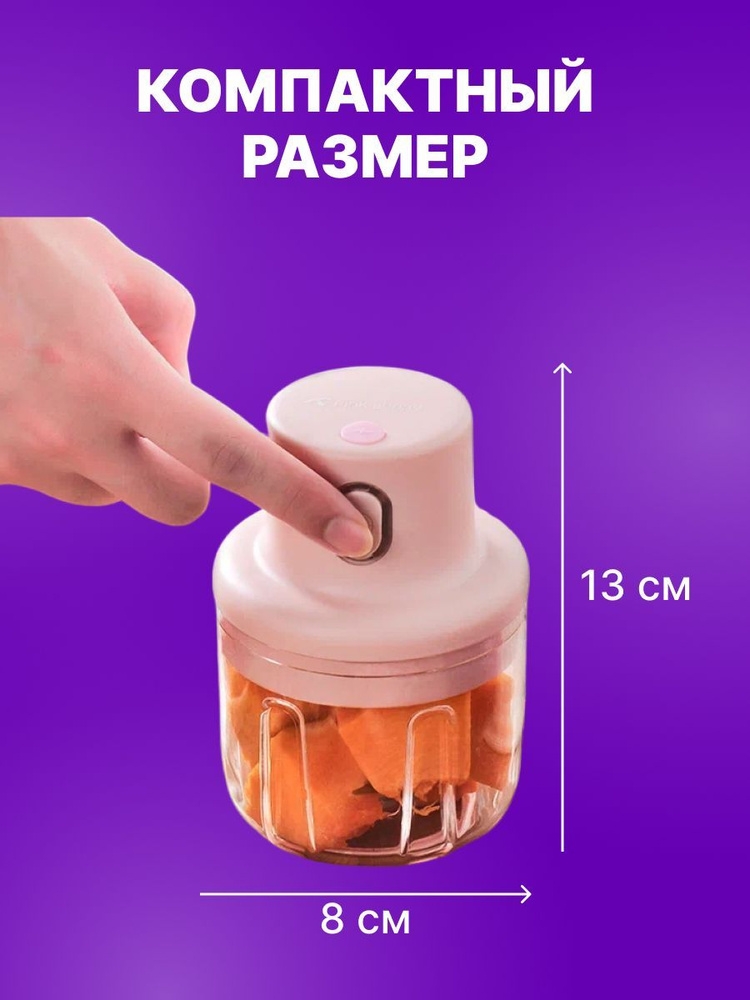 Мини измельчитель – это идеальный помощник на вашей кухне, который поможет быстро и легко приготовить полезные и вкусные смузи. Его портативный и компактный дизайн позволяет брать его с собой куда угодно, будь то работа, пикник или тренировка. Электрический блендер станет незаменимым аксессуаром для тех, кто ведет активный образ жизни и заботится о своем здоровье. Кухонный помощник имеет высококачественные ножи из нержавеющей стали, которые обеспечивают долговечность и отличные результаты при измельчении. Компактный размер устройства позволяет легко хранить его даже в небольшой кухне, не занимая много места. А благодаря простоте в использовании, вам не придется тратить время на сложные инструкции – всего несколько нажатий, и готово. Основное преимущество мини измельчителя – это его мощный мотор, позволяющий эффективно измельчать фрукты, овощи, орехи и даже лед. Беспроводной дизайн дает возможность использовать его в любых условиях, не привязываясь к сети питания. Благодаря USB кабелю для зарядки вы сможете подзарядить блендер в автомобиле, от пауэрбанка или любого USB-адаптера, что делает его идеальным решением для людей, которые много путешествуют. Мини измельчитель подходит как для смузи, так и для приготовления соусов, пюре и даже коктейлей. Вы можете экспериментировать с различными сочетаниями фруктов и овощей, чтобы каждый раз радовать себя и своих близких новыми вкусами. Его легко мыть, что делает процесс приготовления еще более приятным. Наш портативный блендер – ваш верный спутник в мире здорового питания!