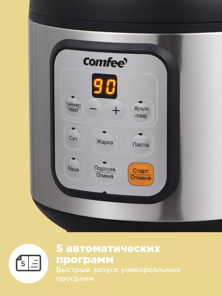 Мультиварка оснащена 5 автоматическими программами, включая режим "мультиповар", благодаря которым вы сможете приготовить суп, жареные блюда, пасту, блюда на пару и даже дессерты.