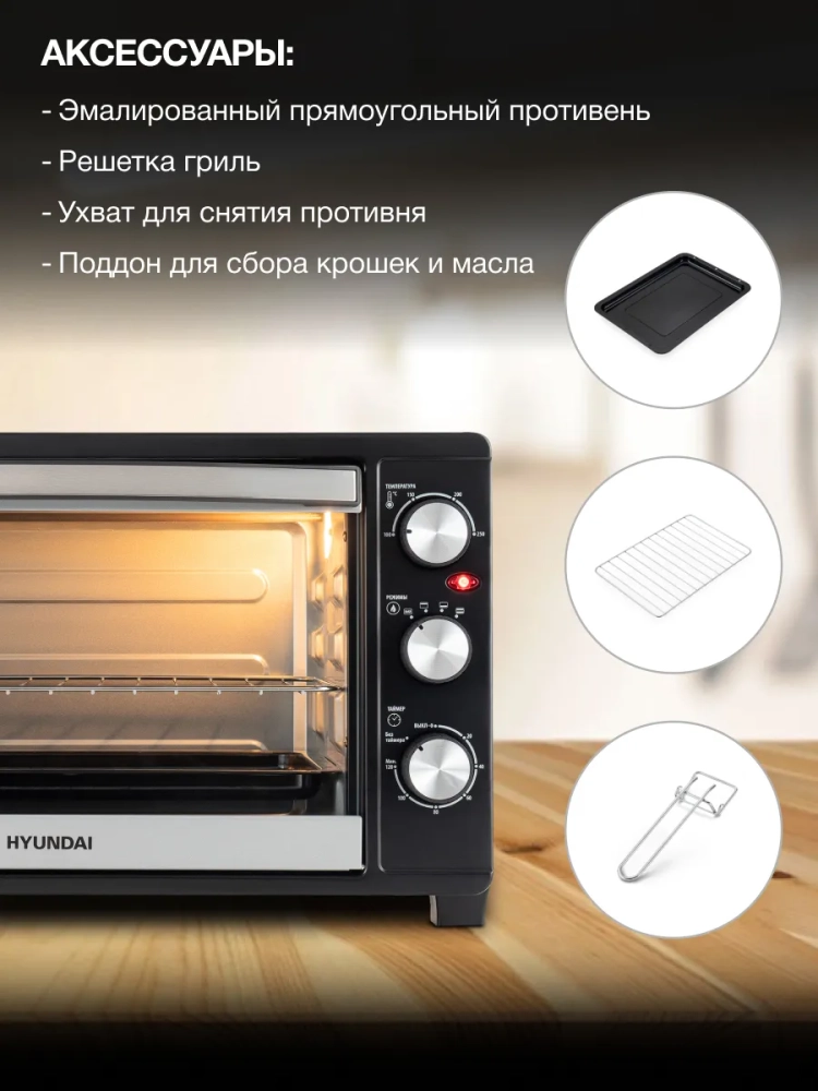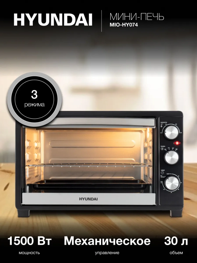 Мини-печь Hyundai MIO-HY074 серебристый/черный, мощность 1500Вт, объем духовки 30л., механическое управление, температура терморегулятора 100С-250С