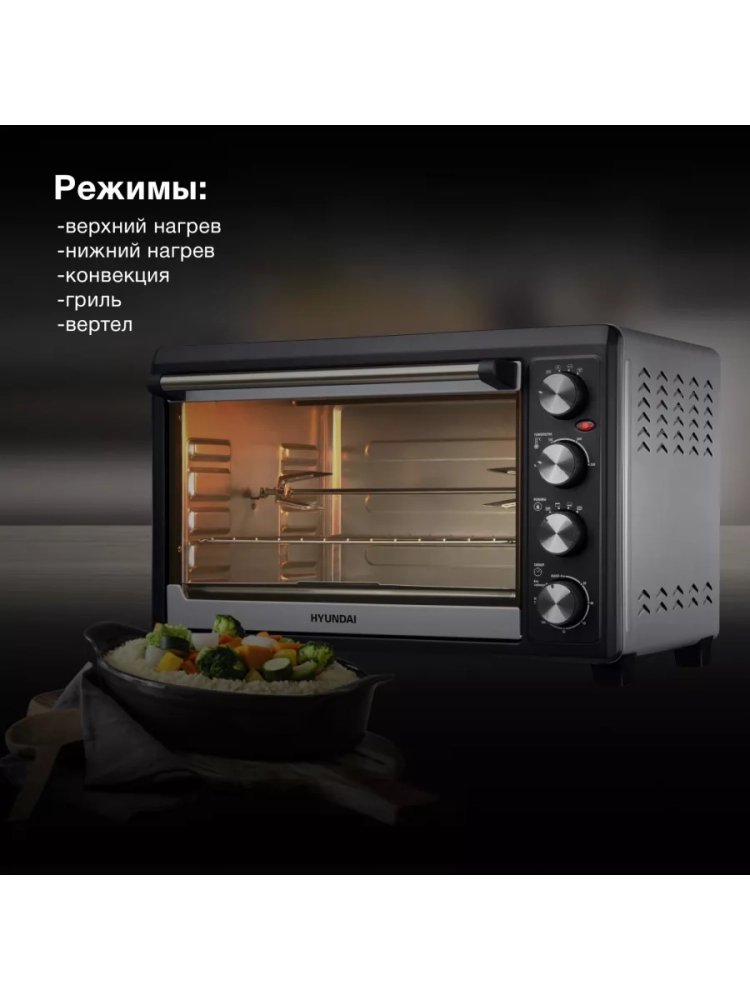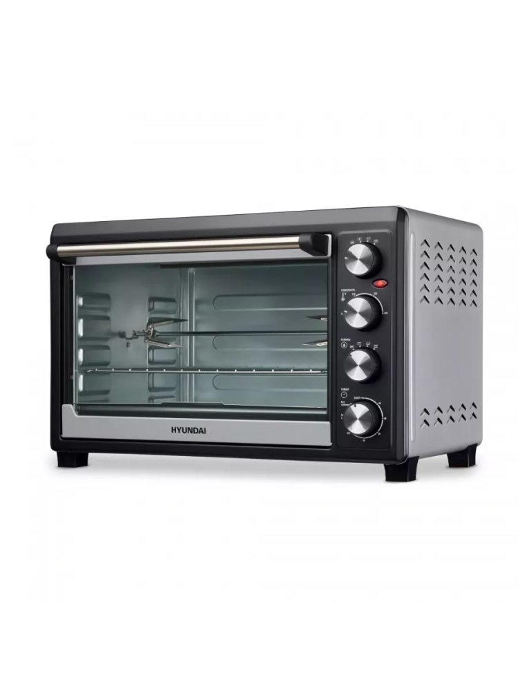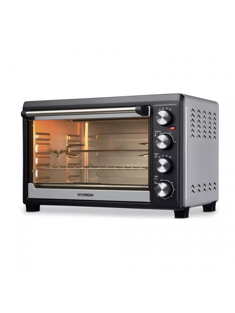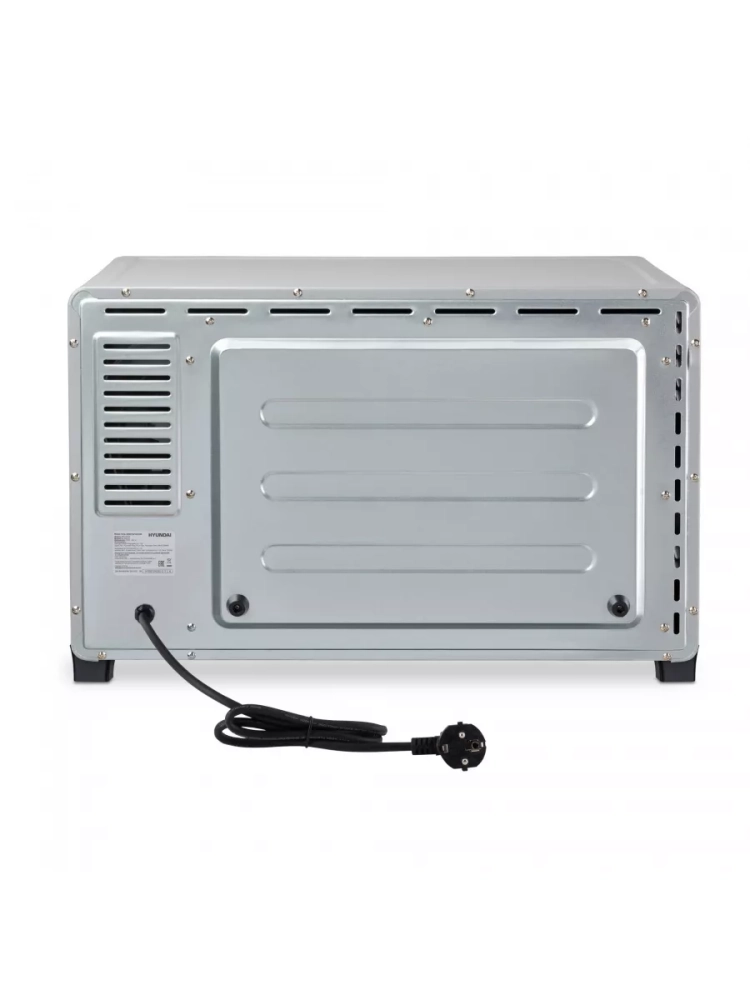 Мини-печь Hyundai MIO-HY076 серебристый/черный, мощность 2000Вт, объем духовки 45л., механическое управление, температура терморегулятора 100-250 С, размеры противня402x312x20.5