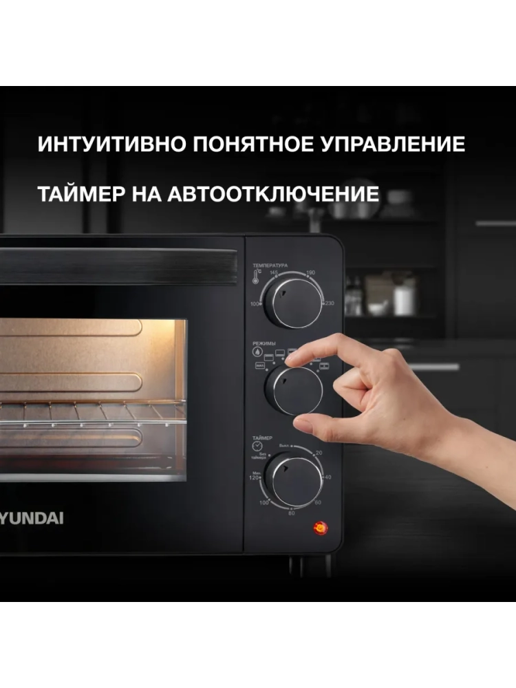 Благодаря скромной потребляемой мощности 1500 Ватт прибор не тратит слишком много энергии, но не теряет в функциональности. Hyundai MIO-HY080 поддерживает различные режимы термической обработки. Еду можно нагревать сверху, снизу, с обоих направлений, с конвекцией и без неё – то есть точно так, как этого требует любой выбранный рецепт. Температура также поддаётся ручной регулировки. Для всех перечисленных параметров есть три отдельных круговых переключателя из алюминия, который не греется во время тепловой обработки в печи. Так что комбинировать их работу под разные условия интуитивно понятно и легко даже человеку без опыта в кулинарии.