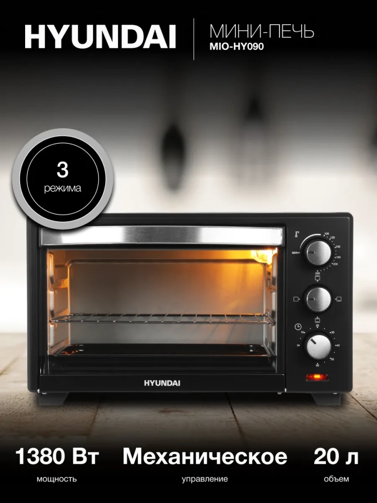 Мини-печь Hyundai MIO-HY090 черный, мощность 1380Вт, объем духовки 20л., механическое управление.