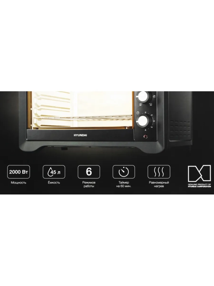 Мини-печь Hyundai MIO-HY095 черный, мощность 2000Вт, объем духовки 45л., механическое управление.