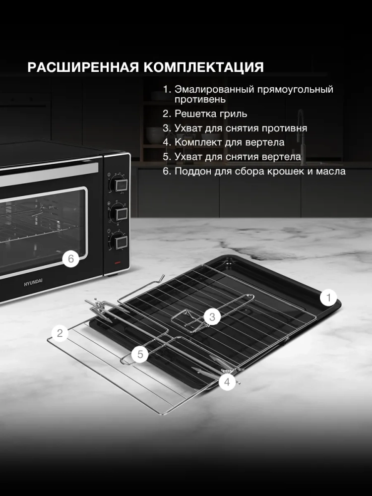 Мини-печь Hyundai MIO-HY107 черный, мощность 2200Вт, объем духовки 45л., механическое управление, температура терморегулятора 100С-250С