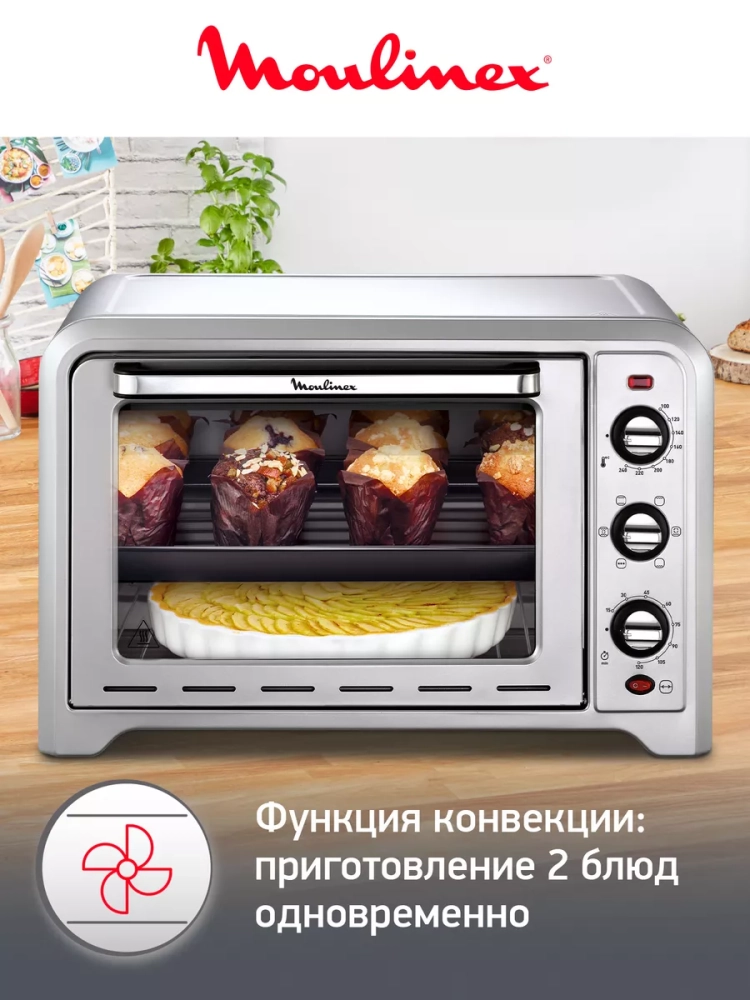 Мини-печь Moulinex Optimo OX464E32. Готовьте и разогревайте любимые блюда в печи Optimo 33 L. Удобный механический термостат, таймер и несколько режимов превращают приготовление любого блюда в удовольствие. Простая механическая регулировка: термостат до 240C, таймер на 120 минут, переключатель 7 режимов. 7 режимов позволят готовить по любому рецепту: конвекция, традиционное приготовление, гриль, выпекание, нижний нагрев, разморозка приготовление на вертеле.