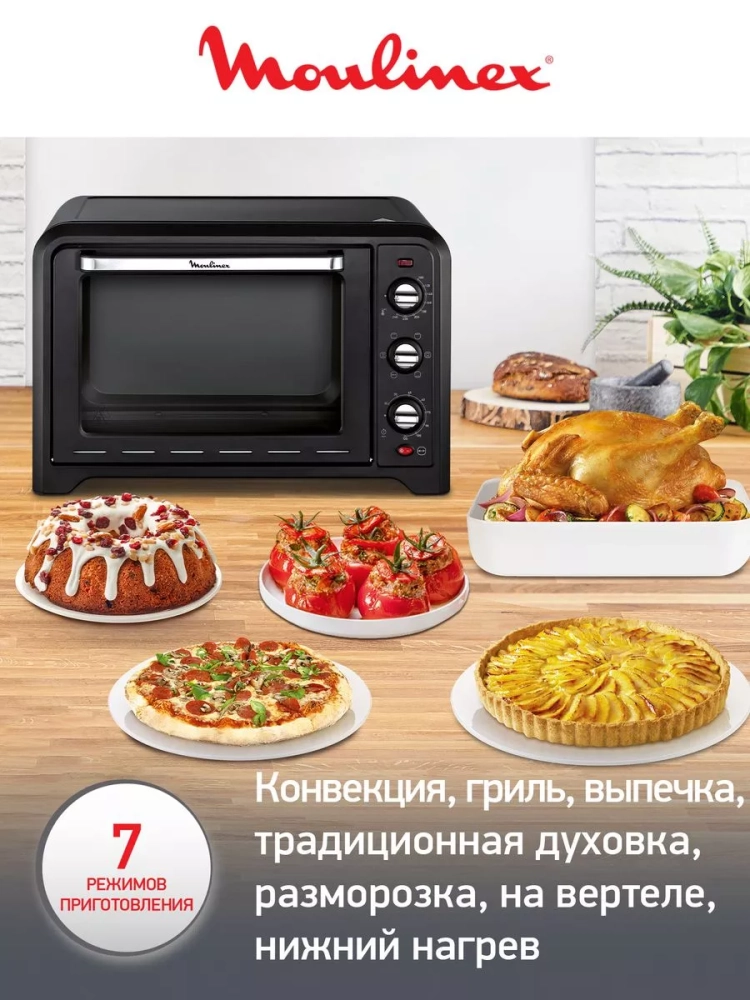 Не смотря на свой компактный размер прибор оснащен 7 режимами работы, с помощью которых вы сможете готовить абсолютно по любым рецептам. Конвекция устройства обеспечивает быстрое и равномерное приготовление каждого блюда, а объем печи 39 л позволит запекать 2 блюда одновременно. Вы с легкостью сможете выпекать традиционную пиццу, запеканку и нежные десерты. Нижний нагрев печи идеально подойдет для заварного крема или террина, а функция разморозки позволит сразу использовать замороженные продукты. Кроме того, в комплекте есть 2 двухсторонние решетки, противень и вертел для птицы благодаря которому вы сможете приготовить праздничный ужин на всю семью.
