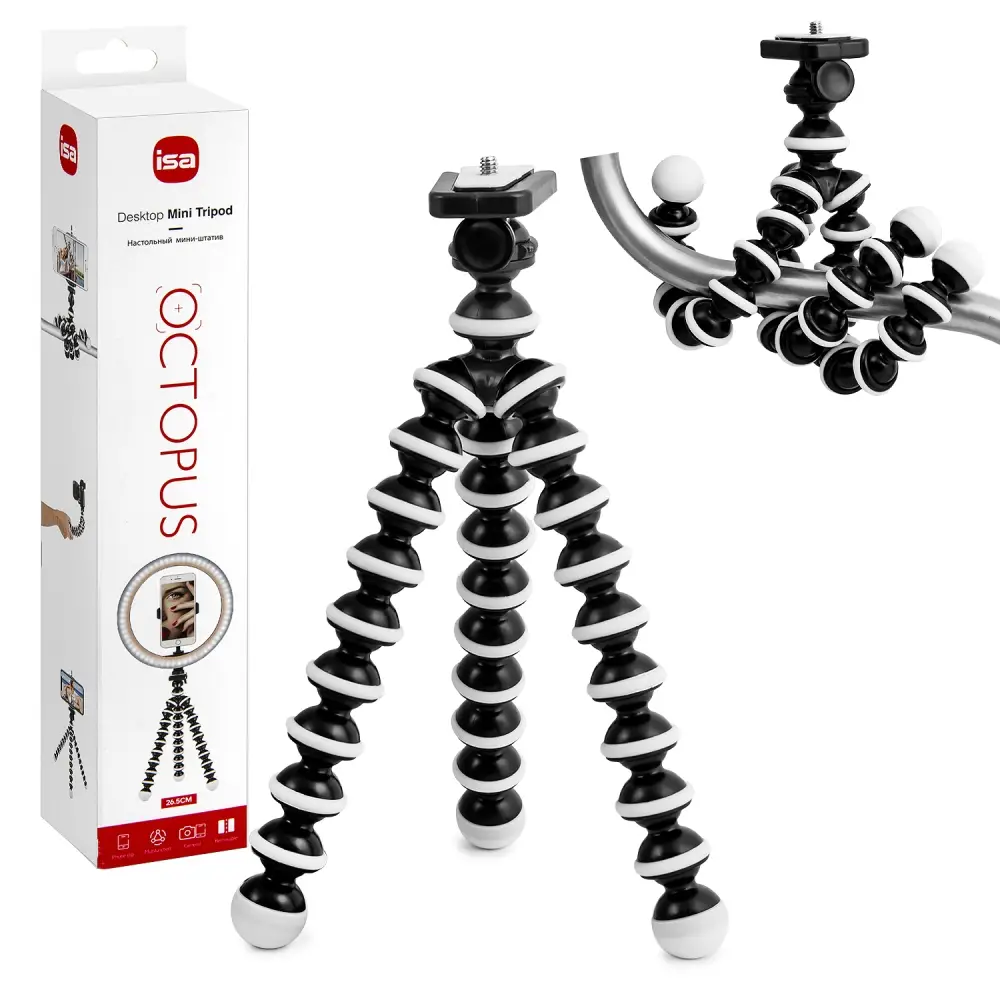 Особенность - Три гибкие ножки позволяют поставить смартфон на стол или закрепить на трубе, ручке двери или любой другой поверхности.