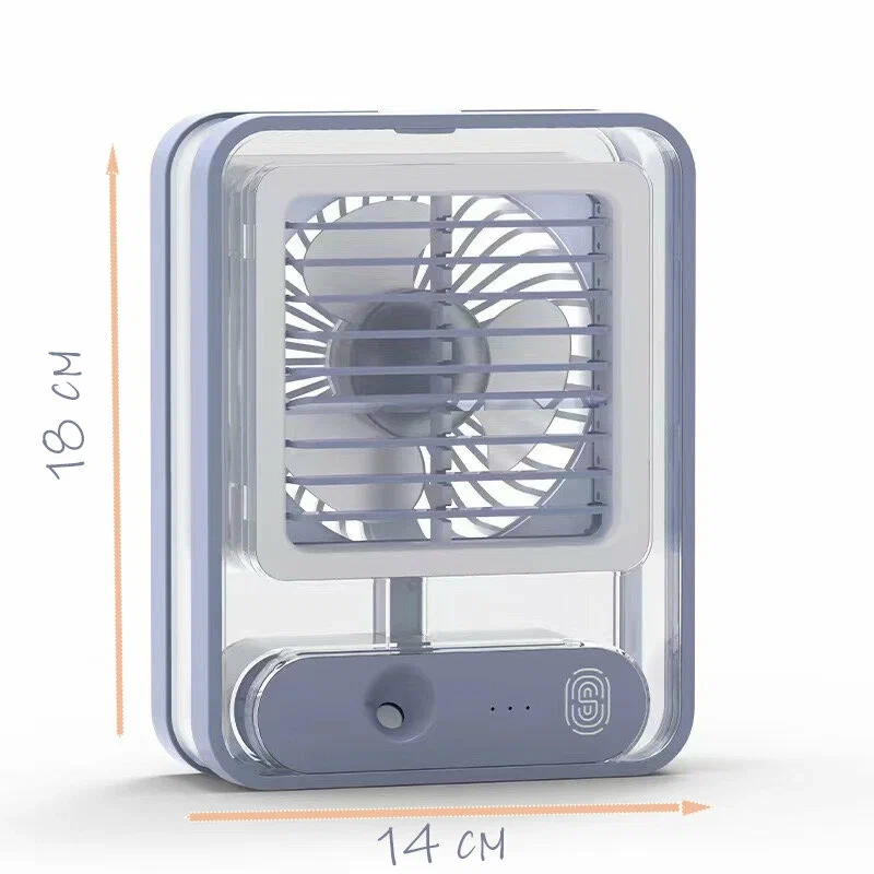 Мини-настольный Кондиционер. Вентилятор способен не только понижать температуру воздуха , он ещё имеет функцию увлажнения воздуха и подсветки. Очень прост в использовании, с обратной стороны вентилятора есть кнопка включения. С лицевой стороны есть сенсорная кнопка переключения режимов. Долгое нажатие включает и выключает подачу пара и свет. Короткое нажатие переключает режимы обдува, их всего 3. Налейте 280 мл воды в резервуар.