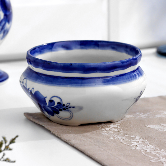 Собственный стиль Гжели — синие и голубые узоры, растительный орнамент и витиеватые украшения на белом фоне. В каждом предмете легко и непринуждённо варьируются букеты и гирлянды, вводятся геометрические пояски, похожие на вязаное кружево, изделия украшает декоративная лепнина, изображаются пейзажные сюжеты.