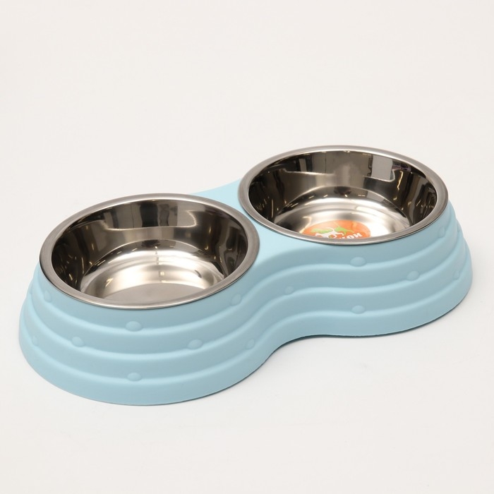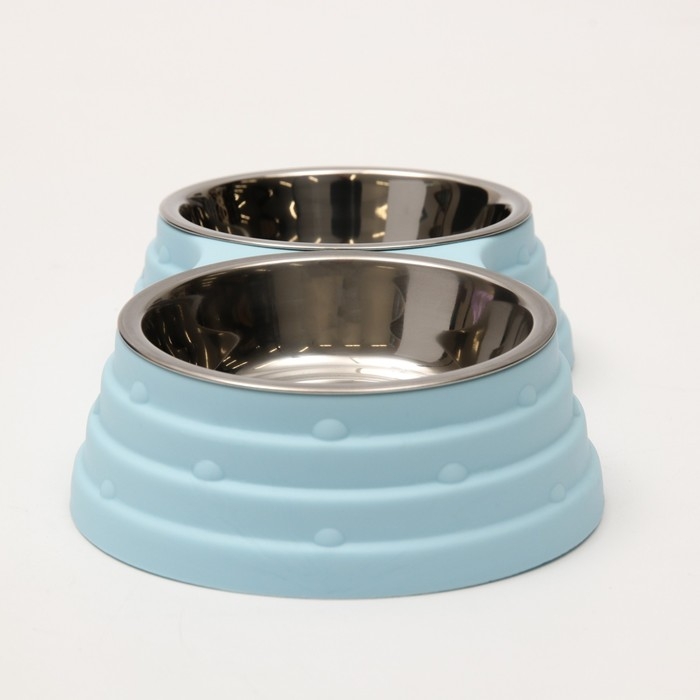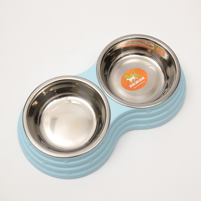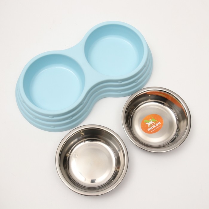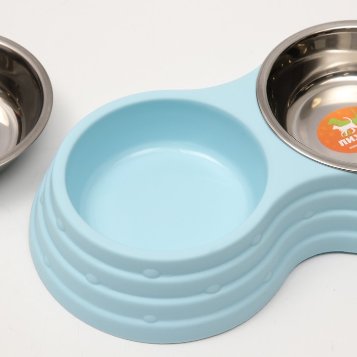 Миска металлическая двойная на пластиковом основании 2 х 160 мл, 25 х 14 х 5 см, голубая