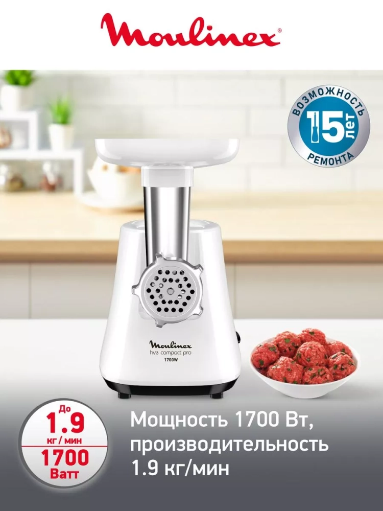 Электрическая мясорубка Moulinex HV3 ME301132 с насадками впечатлит вас своей высокой производительностью и точным измельчением мяса.