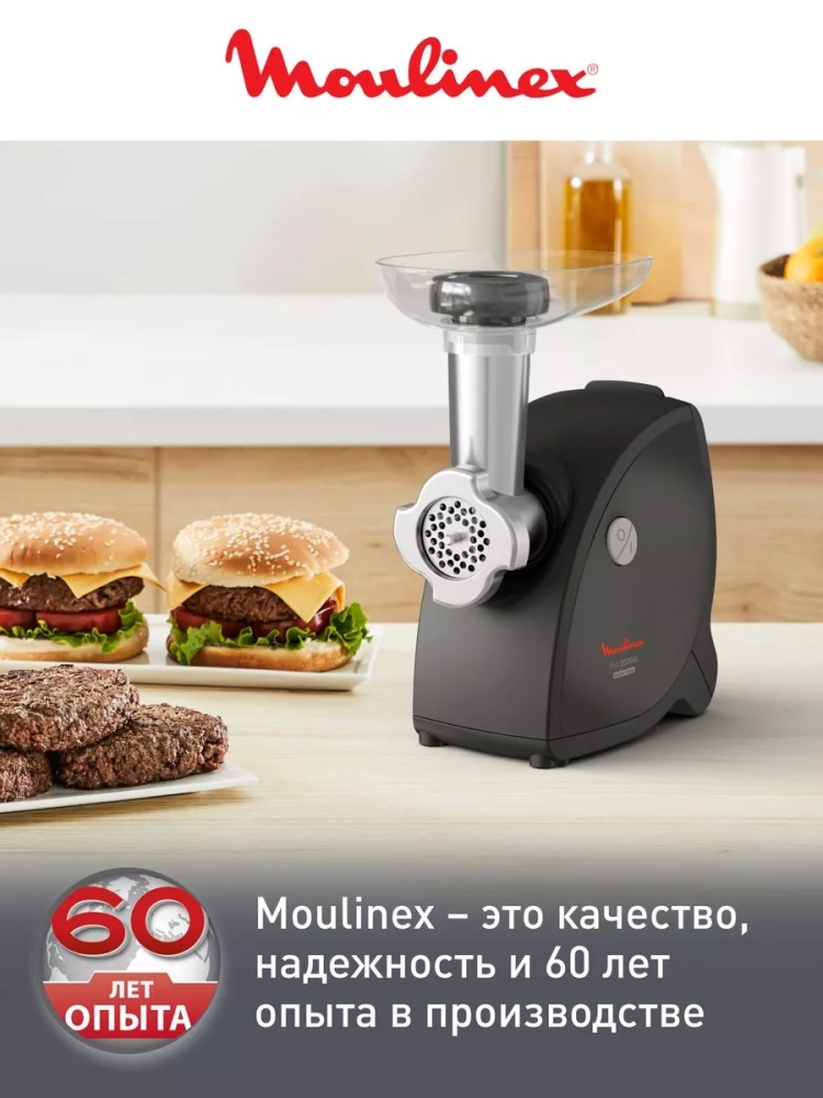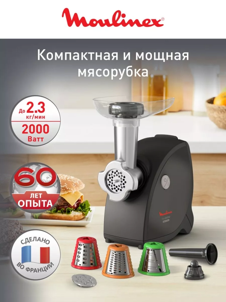 Насадки для измельчения предлагают широкие возможности, благодаря которым вы также сможете идеально и быстро подготовить салаты и гарниры. Мясорубка от Moulinex имеет компактный корпус и не занимает много места на кухне, а также поможет достичь быстрых и равномерных результатов измельчения.