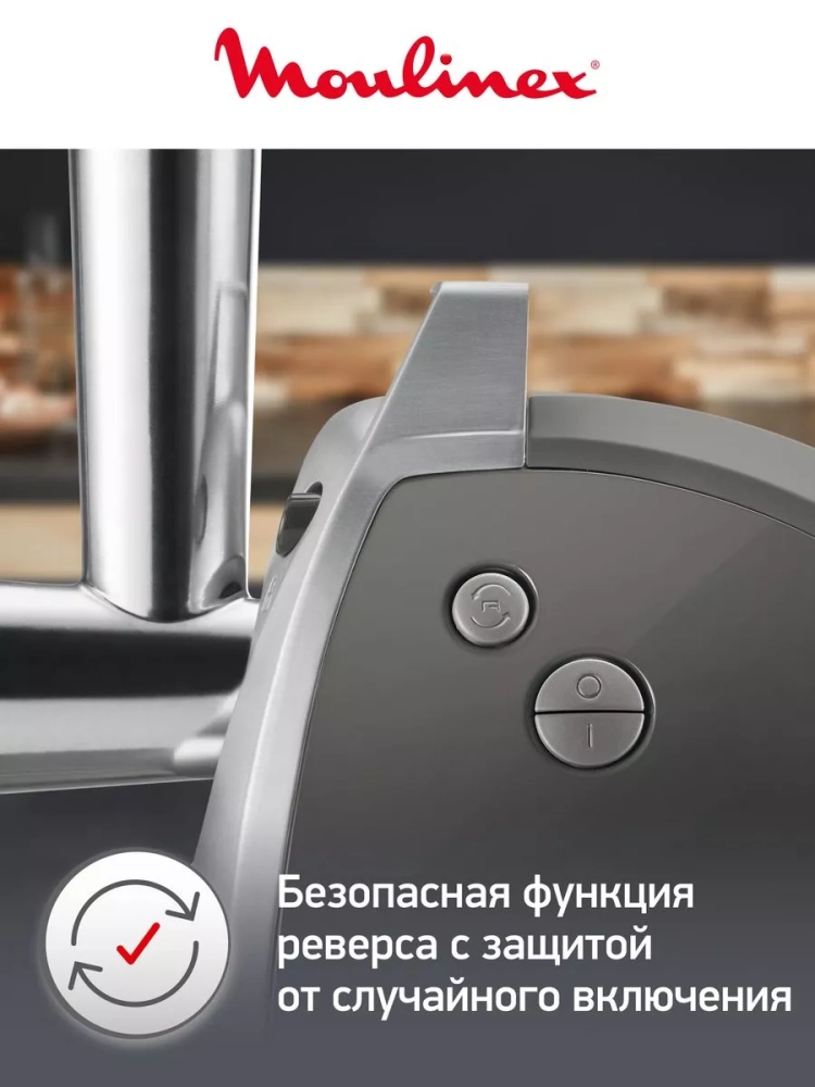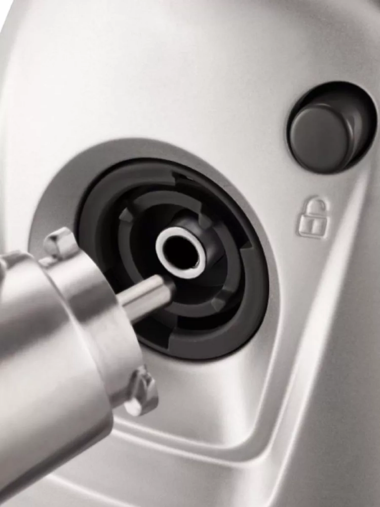 Отличная производительность. Мощная мясорубка перерабатывает до 4,5 кг мяса в минуту благодаря надежному мотору мощностью 2200 Вт (максимальная мощность при блокировке). Безопасная функция реверса. Функция реверса с защитой от случайного включения защищает мотор от поломки. Благодаря металлическому соединению со шнеком мотор защищен от перегрузки. Широкая ручка для удобной переноски и место для хранения шнура и аксессуаров.