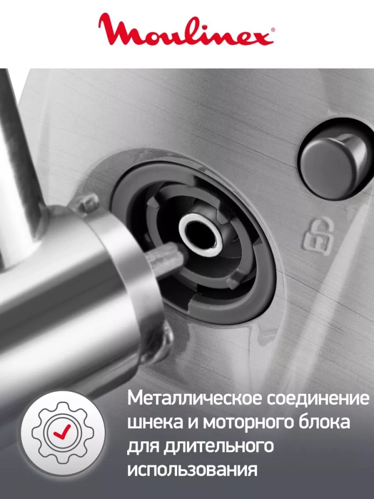 Самозатачивающийся нож для длительного перемалывания мяса. Moulinex – это надежность, качество и 60 лет опыта в производстве мясорубок.