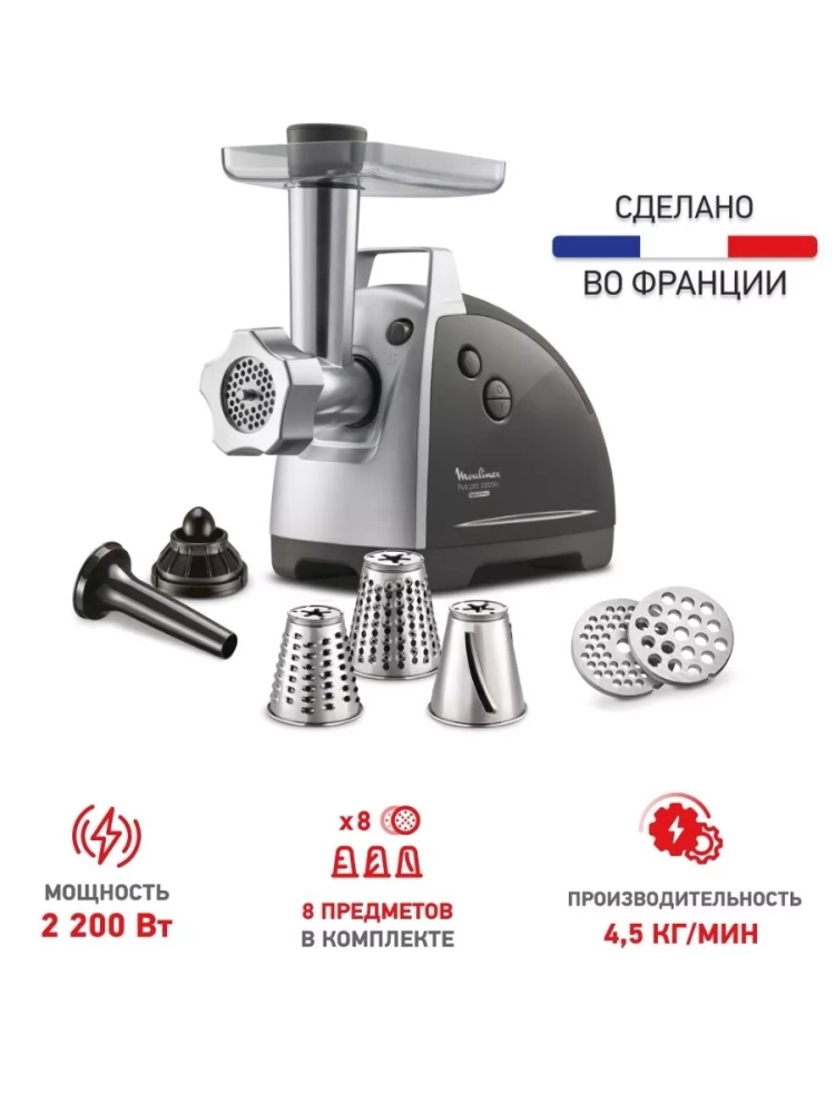 Электрическая мясорубка Moulinex HV8 Pro ME687832. Представляем вашу новую мощную и многофункциональную электромясорубку для приготовления разнообразных блюд каждый день: тефтели, соус болоньезе, котлеты для бургеров и даже салаты и гарниры благодаря специальному измельчителю в комплекте.
