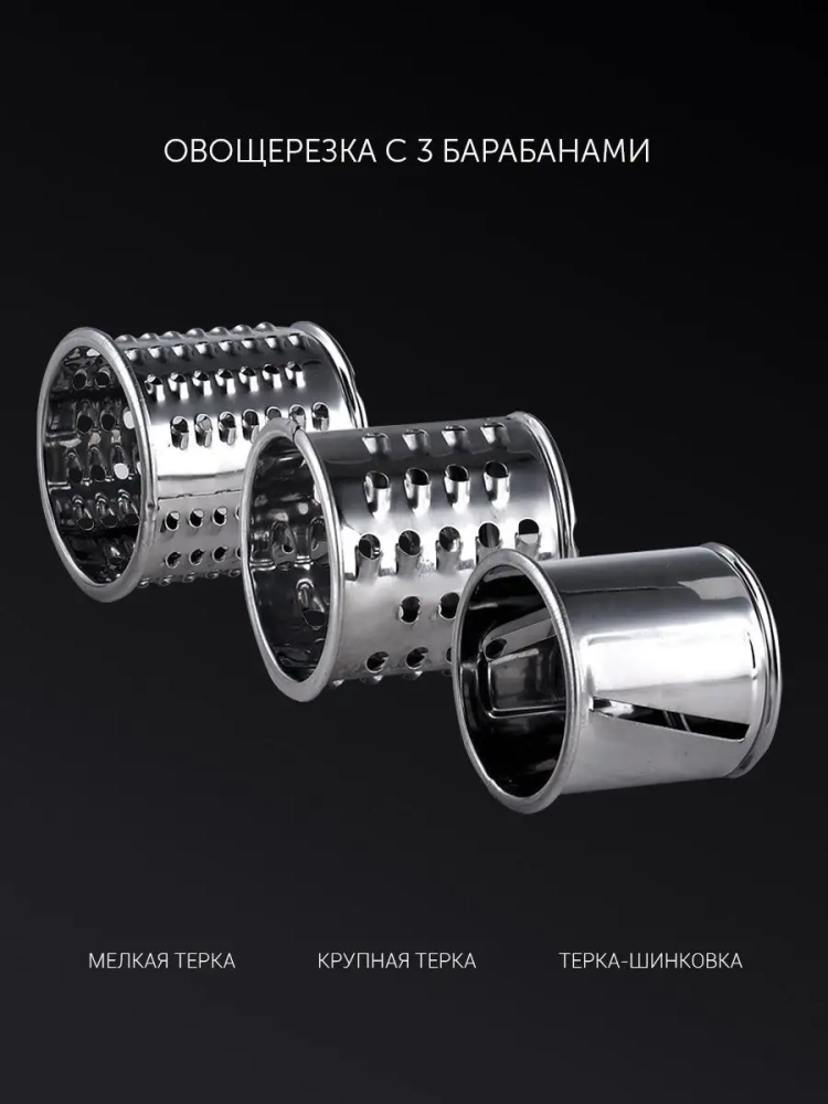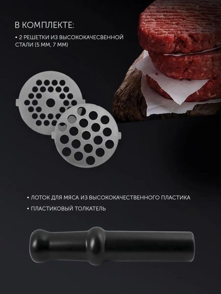 В наборе представлены разнообразные сменные насадки, которые расширяют возможности девайса: Два круглых диска из нержавеющей стали (5 мм и 7 мм) для приготовления фарша разной консистенции. Сменные стальные насадки гарантируют долговечность и надежность. Овощерезка с тремя барабанами разной формы для шинковки, нарезки и терки овощей. Вы сможете легко измельчить морковь, свеклу, яблоки, капусту, кабачки для салатов или заморозки. Пластиковый лоток - чаша. Пресс - толкатель.