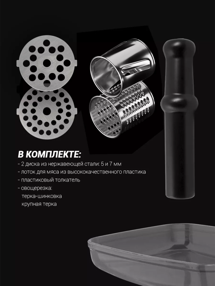 Два круглых диска из нержавеющей стали (5 мм и 7 мм) для приготовления фарша разной консистенции. Сменные стальные насадки гарантируют долговечность и надежность.