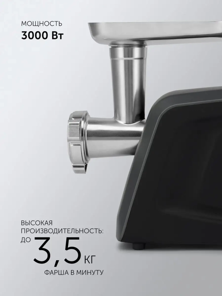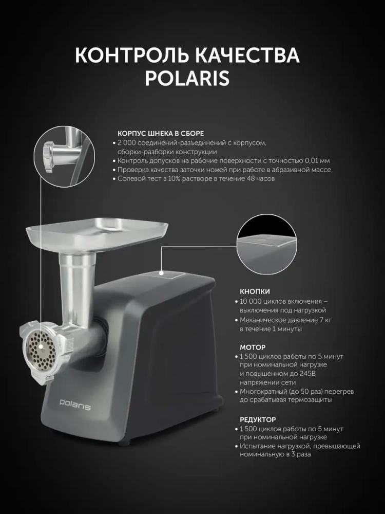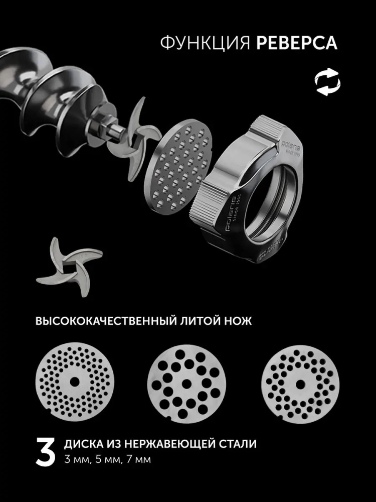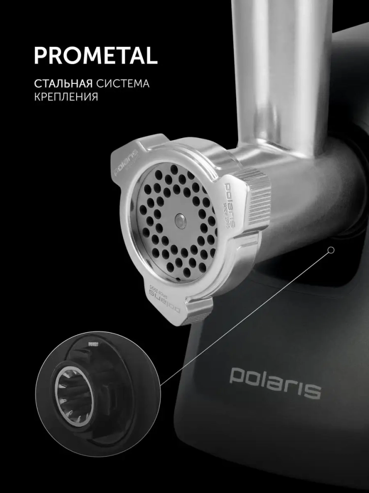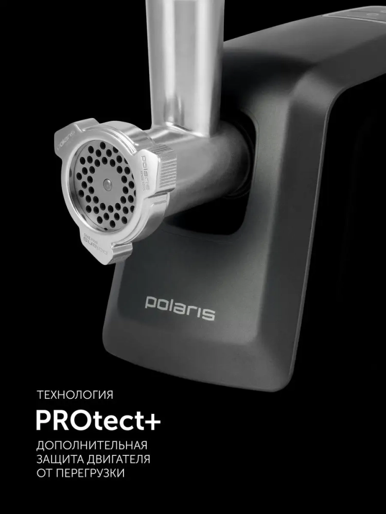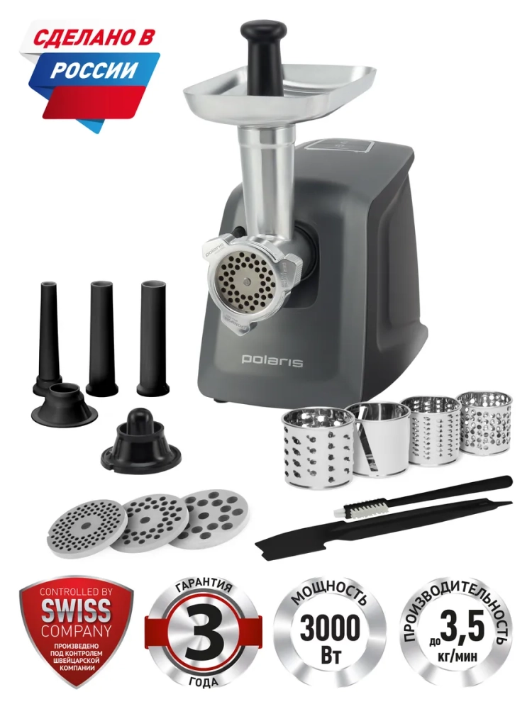 Мясорубка электрическая с овещерезкой Polaris PMG 3090 RUS облегчит и ускорит процесс приготовления разнообразных блюд. Оснащена надежным мотором мощностью 3000 Вт, что обеспечивает высокую производительность прибора: до 3,5 кг мяса в минуту. Подходит для приготовления домашних колбас, кеббе, салатов и овощных закусок. Функция реверс помогает быстро, не разбирая мясорубку, прочистить ее от застрявших кусочков мяса и жил. Управление осуществляется двумя кнопками, удобно расположенными сверху на корпусе. Для надежной работы измельчающего блока реализована стальная система креплений Prometal и конструкция редуктора ProGear Inside с износостойкой металлической шестерней. За защиту двигателя от перегрузок отвечает технология PROtect+. Она автоматически отключит прибор при перегреве, предотвращая поломку и продлевая срок его службы. Загрузочный лоток и толкатель гарантируют безопасное добавление продуктов в шнек электромясорубки. Электрическая мясорубка Polaris включает расширенный набор насадок. В комплекте идут 3 решетки для перекручивания фарша из нержавеющей стали с диаметром отверстий 3, 5 и 7 мм, 3 насадки для колбасок, одна для кеббе и овощерезка с 4 барабанами (мелкая и крупная терки, шинковка и терка для драников). Для удобства очистки предусмотрен специальный аксессуар для удаления остатков фарша из решетки, щеточка и лопатка. Мясорубка с насадками электрическая обладает стильным дизайном и высокой функциональностью, не занимает много места на столешнице и фиксируется с помощью нескользящих ножек. Гарантия на мясорубку Polaris 3 года.