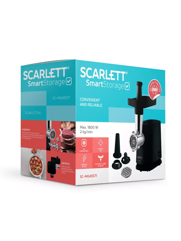 Электромясорубка Scarlett SC-MG45S71 станет вашим верным помощником в приготовлении мясных полуфабрикатов: благодаря мощному мотору она производит до 2 кг фарша в минуту. В комплект входят 2 решётки с отверстиями различного диаметра. А ещё вы сможете набить домашние колбаски и приготовить кеббе – трубочки из мясного фарша с разнообразными начинками. Соответствующие насадки прилагаются. Прокручивая жёсткое, жилистое мясо, волокна которого блокируют шнек, используйте реверс, и вам не понадобится разбирать и чистить горловину прибора. В корпусе есть специальный отсек для второго диска – он не потеряется и всегда будет под рукой. Также предусмотрено место для сматывания сетевого шнура, что очень удобно при хранении устройства. Ножки прорезинены и не позволят прибору соскользнуть со стола.