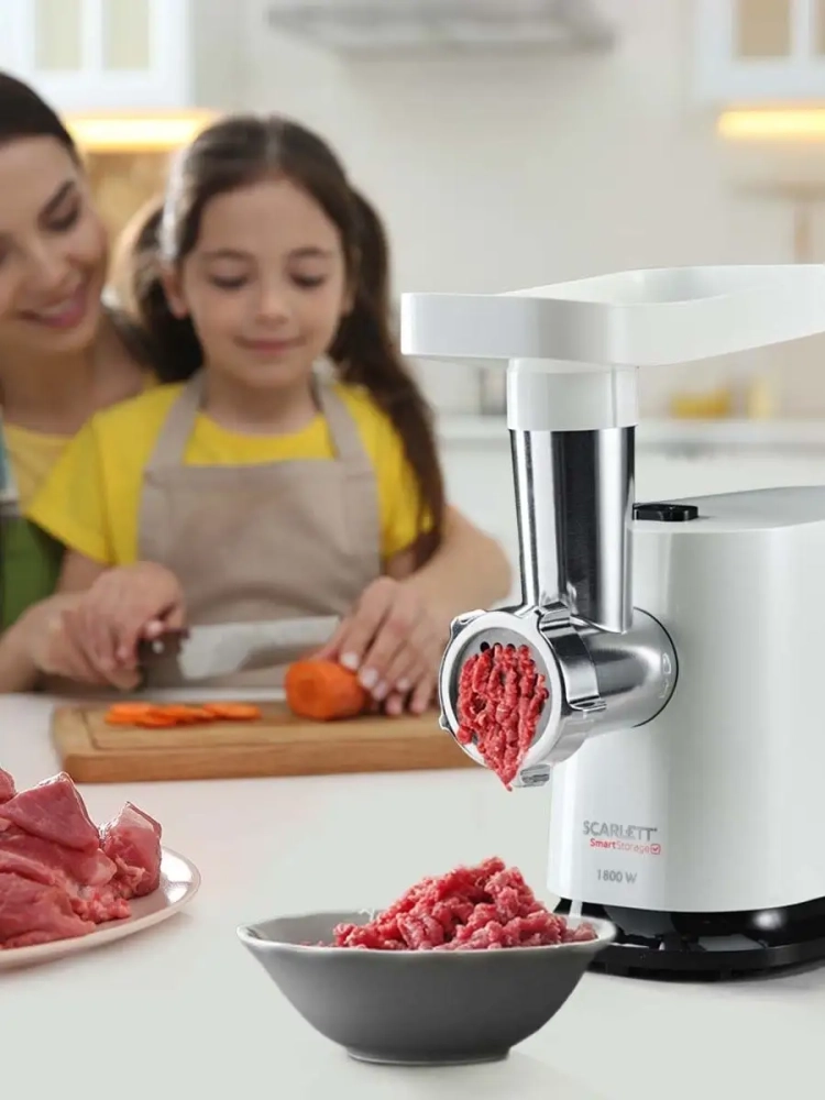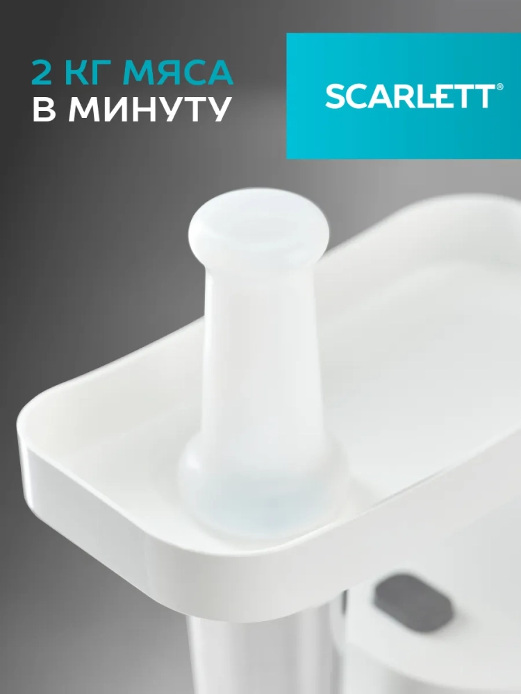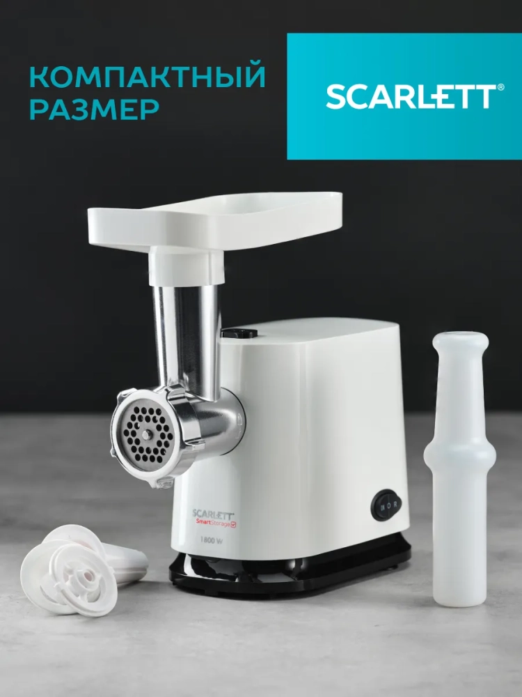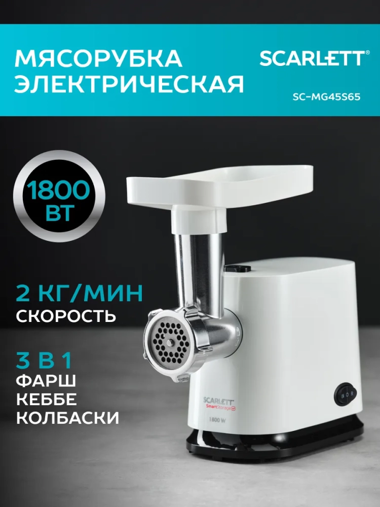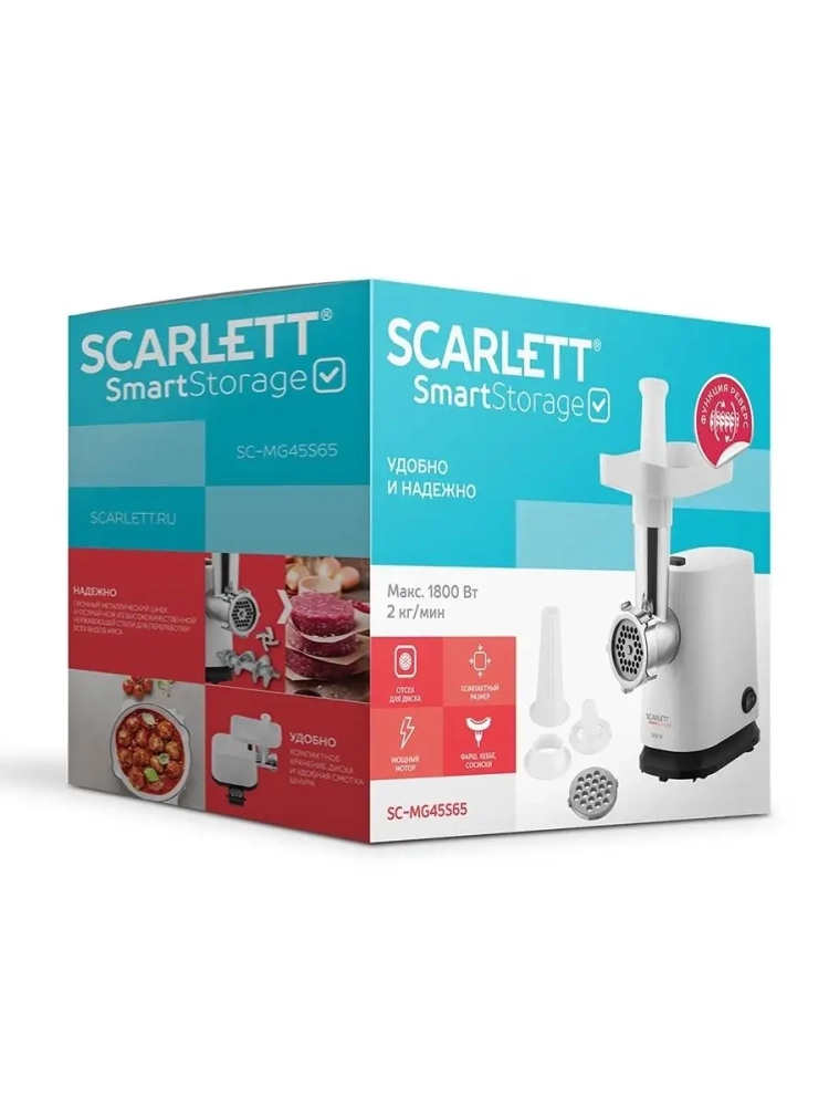 Электрическая мясорубка с насадками SC-MG45S65 - многофункциональный прибор, который поможет разнообразить меню всей семьи. Перфорированные диски для фарша с отверстиями 5 и 7 мм помогут получить фарш среднего и крупного помола для различных блюд. Функция реверс поможет устранить проблему скопления мяса в шнеке. Технология SAFE PRO позволяет предотвратить перегрев и перегрузку двигателя, тем самым продлевая срок его эксплуатации. Высокопрочный металлический шнек и нож из высококачественной нержавеющей стали обладают повышенной износостойкостью, тем самым повышая эффективность работы и продлевая срок службы прибора.Вы сможете набить домашние колбаски и сделать восточное блюдо кеббе, мясные трубочки с овощными, грибными, сырными и другими начинками на ваш вкус. Smart Storage - компактное хранение диска и удобная смотка шнура оптимизируют кухонное пространство. Профессиональная электромясорубка