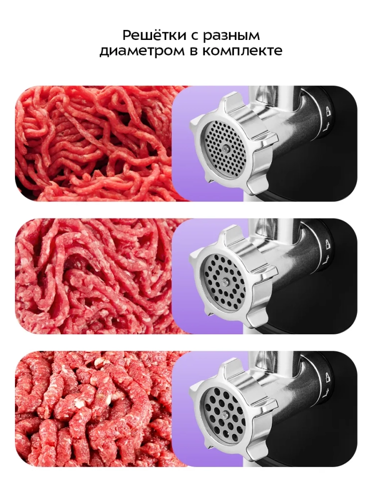 Мясорубка имеет две скорости работы и функцию реверса. В комплект мясорубки входят три решетки для изготовления фарша с отверстиями 3 мм, 5 мм и 7 мм, а также насадки для приготовления колбас и кеббе. Сверху в корпусе мясорубки есть отсек для удобного хранения аксессуаров.