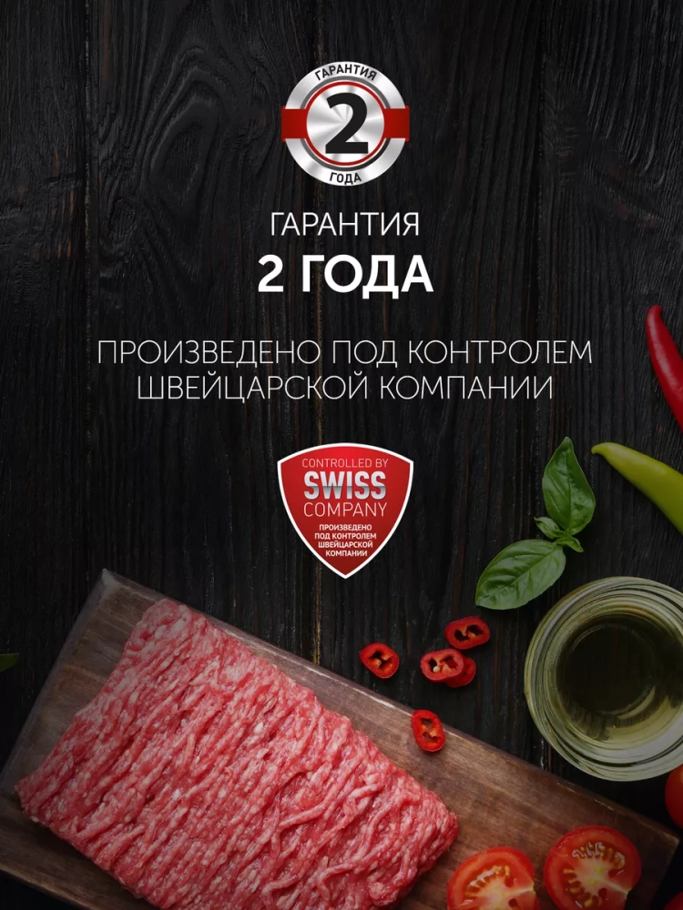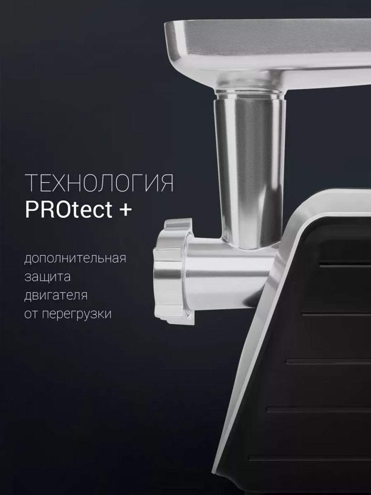 Одной из ключевых особенностей мясорубки является функция реверса. Она позволяет избежать застревания мяса и обеспечивает бесперебойную работу устройства. Благодаря нескользящим ножкам, мясорубка с насадками овощерезки будет надежно стоять на поверхности.