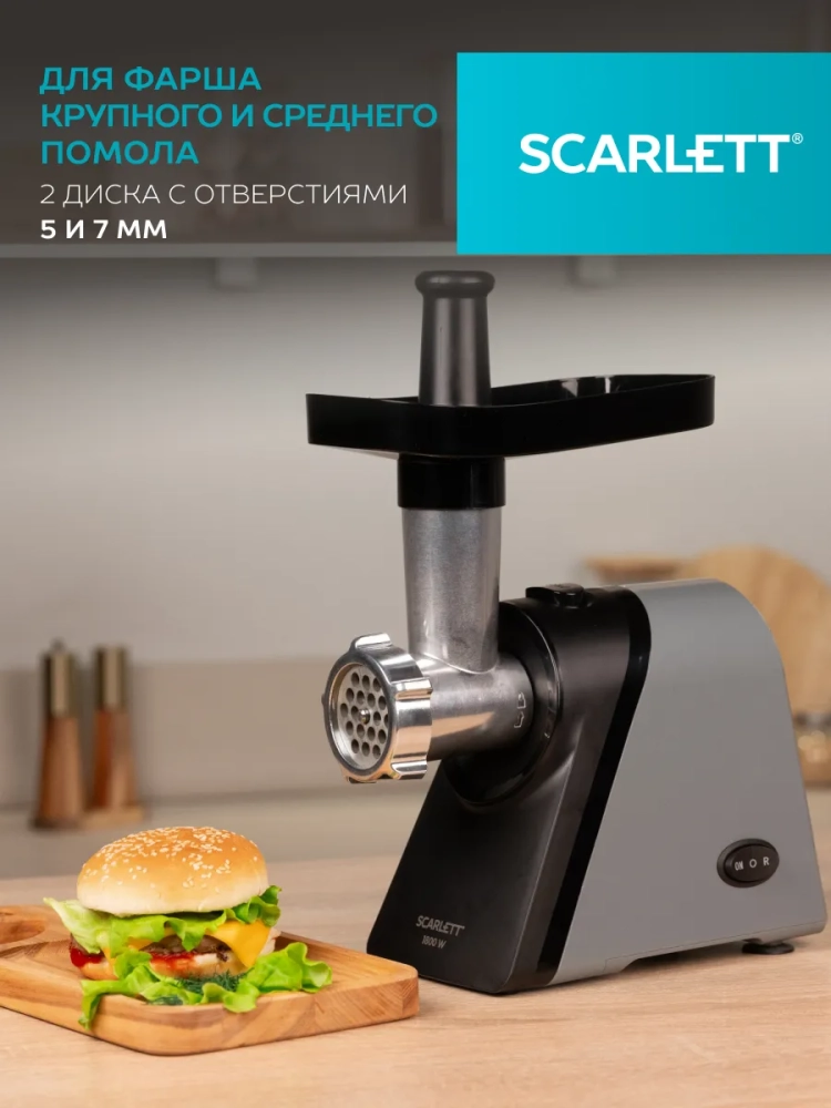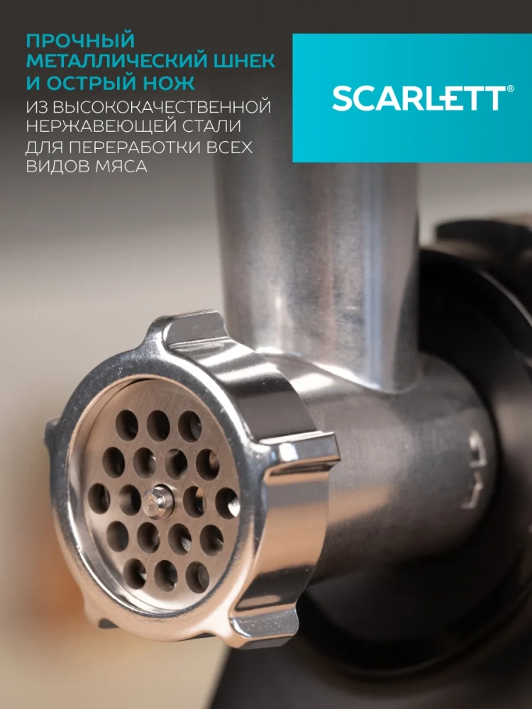 Компактная мясорубка SC-MG45S76 – универсальный прибор, который разнообразит меню всей семьи! Перфорированные диски для фарша с отверстиями 5 и 7 мм помогут получить фарш среднего и крупного помола для различных блюд. Функция реверс поможет устранить проблему скопления мяса в шнеке. В комплекте идут насадки для приготовления домашних колбасок и кеббе – традиционного восточного блюда. Мясные трубочки можно приготовить с овощными, грибными, сырными и другими начинками на ваш вкус.