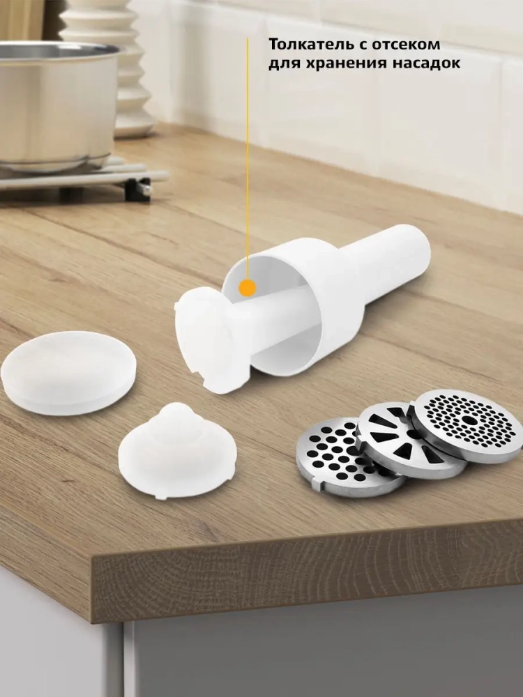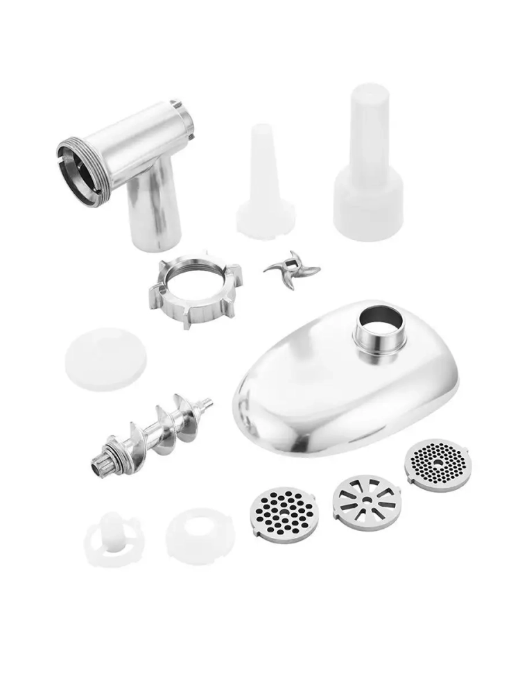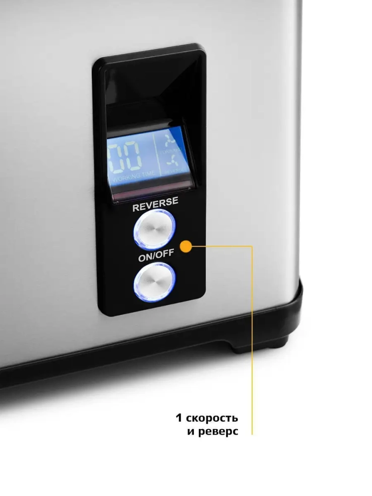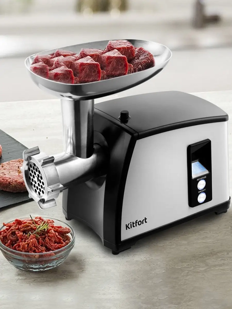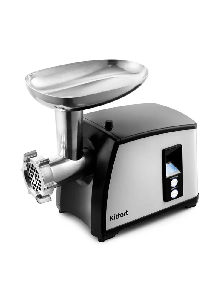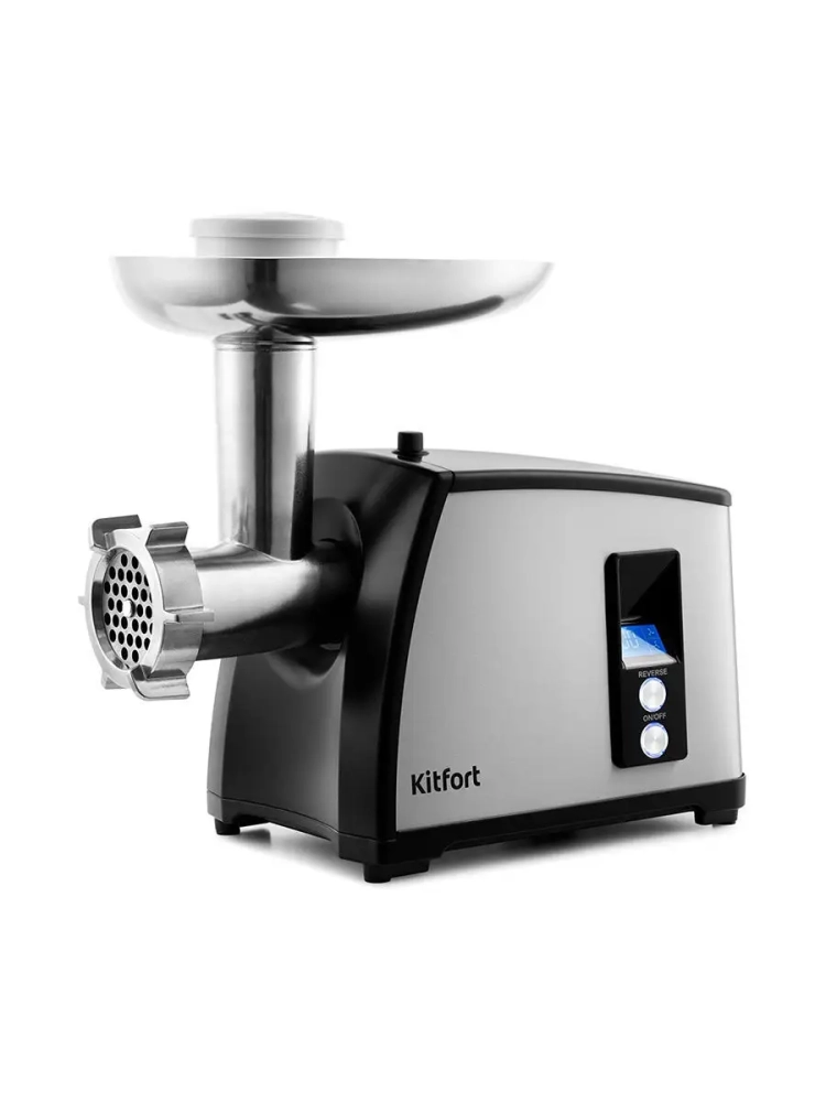 У мясорубки Kitfort KT-2105 мотор высокой мощности, а корпус выполнен из пластика с металлическими вставками. На корпусе есть панель управления с дисплеем и двумя кнопками со световой индикацией. Мясорубка имеет одну скорость работы и функцию реверса. В комплект входят 3 решетки для изготовления фарша, а также специальные насадки для колбас и кеббе. Толкатель мясорубки сделан в виде контейнера с крышкой, в котором удобно хранить все насадки и решетки.
