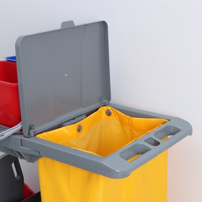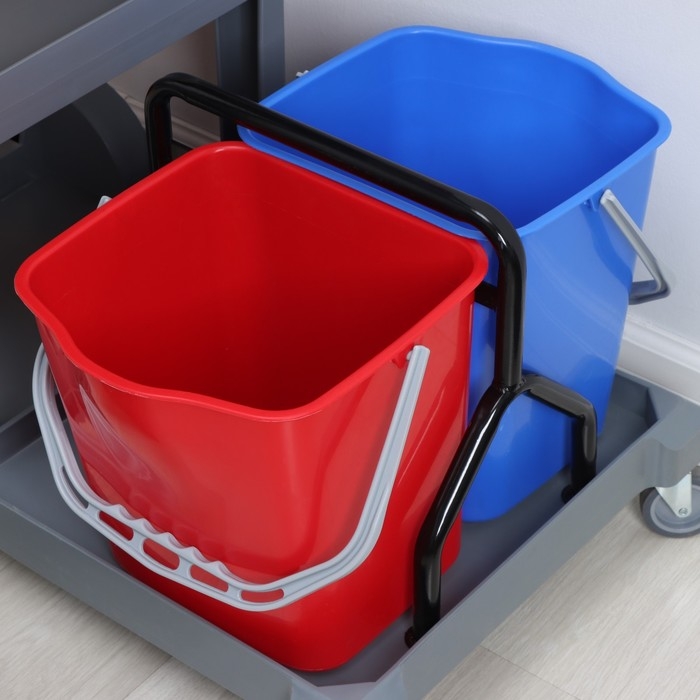 Многофункциональная тележка для клининга с вёдрами, отжимом и лотками, цвет серый