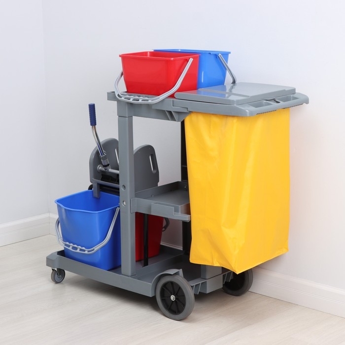 Тележка уборочная универсальная - маневренное и удобное изобретение, не требует много пространства для хранения, значительно упрощает уборку помещения.