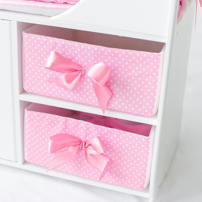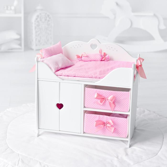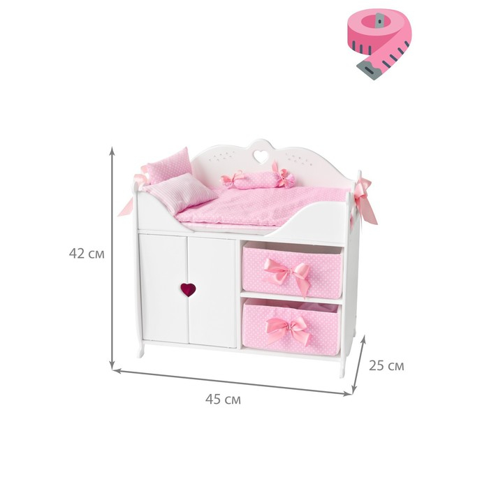 Многофункциональный игровой комплекс — отличный подарок для ребёнка, который любит играть с куклами. В нём можно хранить одежду и все аксессуары для пупсиков. Наверху комплекса находится кукольная кроватка.