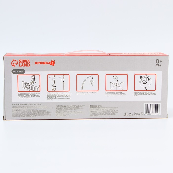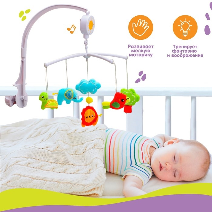 Мобиль на кроватку, проигрывающий колыбельные мелодии, отличная игрушка и подарок для малыша от 0 мес. Его можно прикрепить с помощью кронштейна, который идет в комплекте, на кроватку или коляску. Основа с игрушками вращается на 360 градусов. Все погремушки съемные, ими можно играть по отдельности, а также их очень удобно мыть.